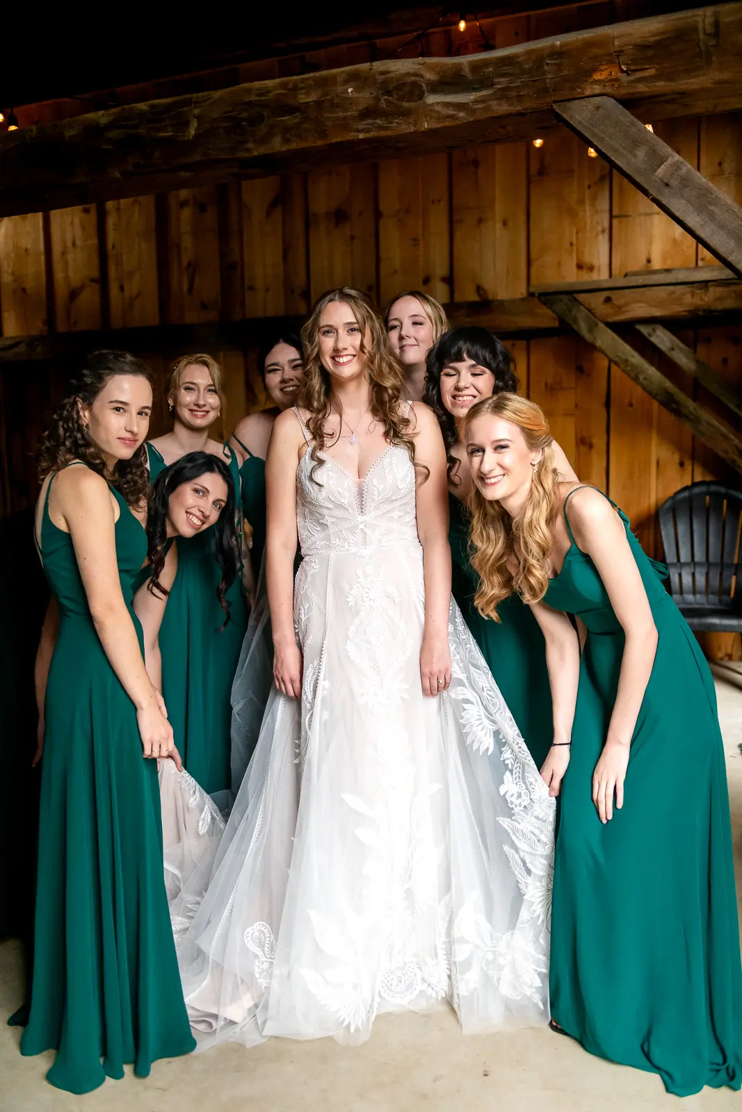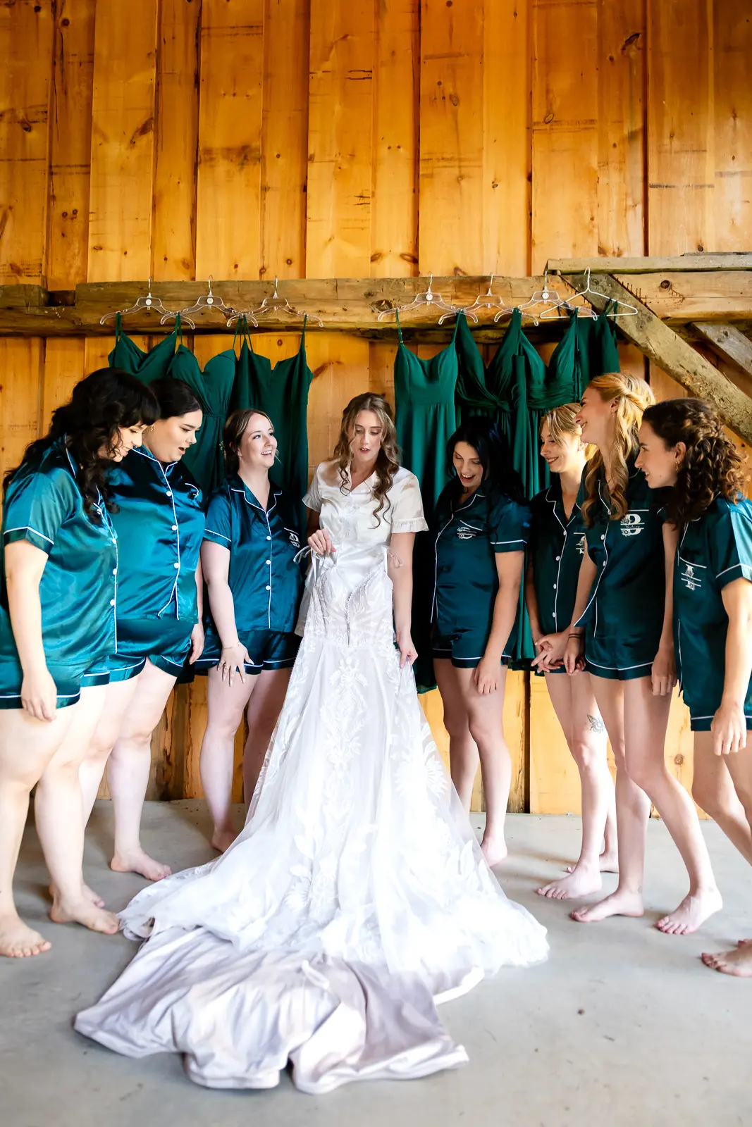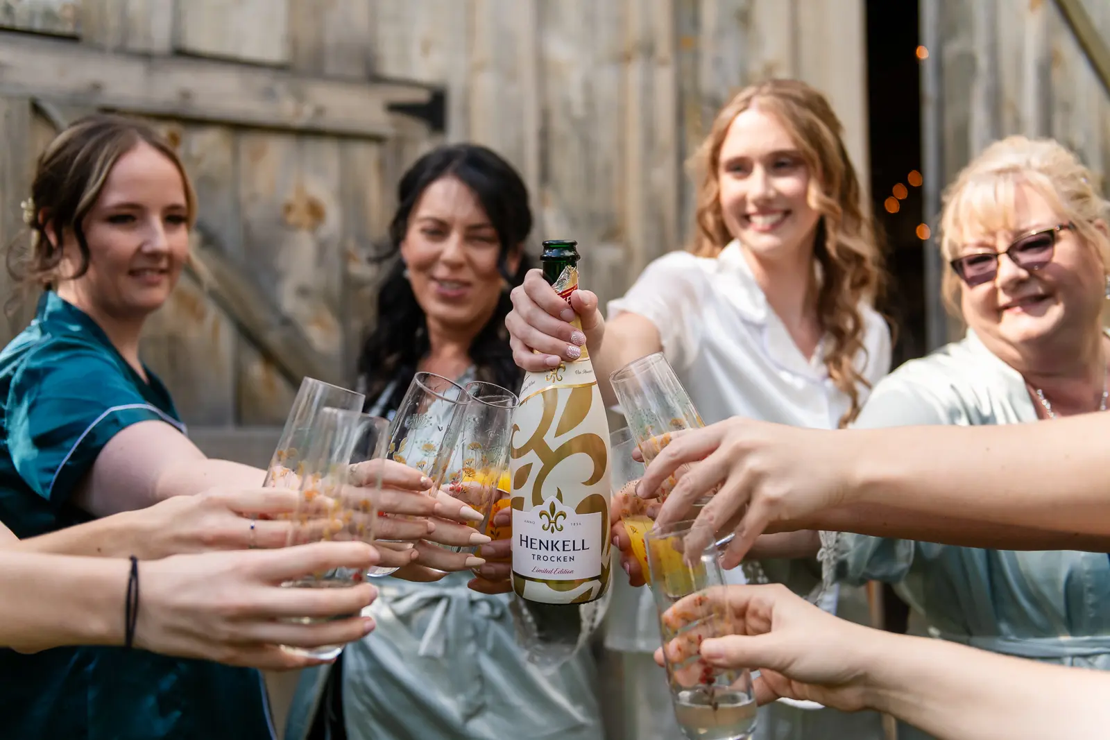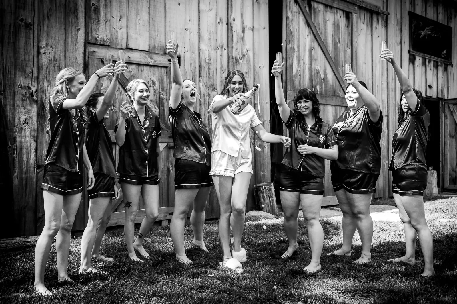 The morning started in the barn where Jessica and the ladies got ready together. It was the kind of space that instantly sets the tone for the day. Rustic, light-filled, and full of energy. There was music playing, stories being shared, and a lot of laughter as everyone moved through hair, makeup, and final touches. At one point, the group stepped outside the barn and popped champagne together, glasses raised and bubbles flying. It was joyful and unscripted and exactly the kind of moment that makes getting ready photos feel alive.
