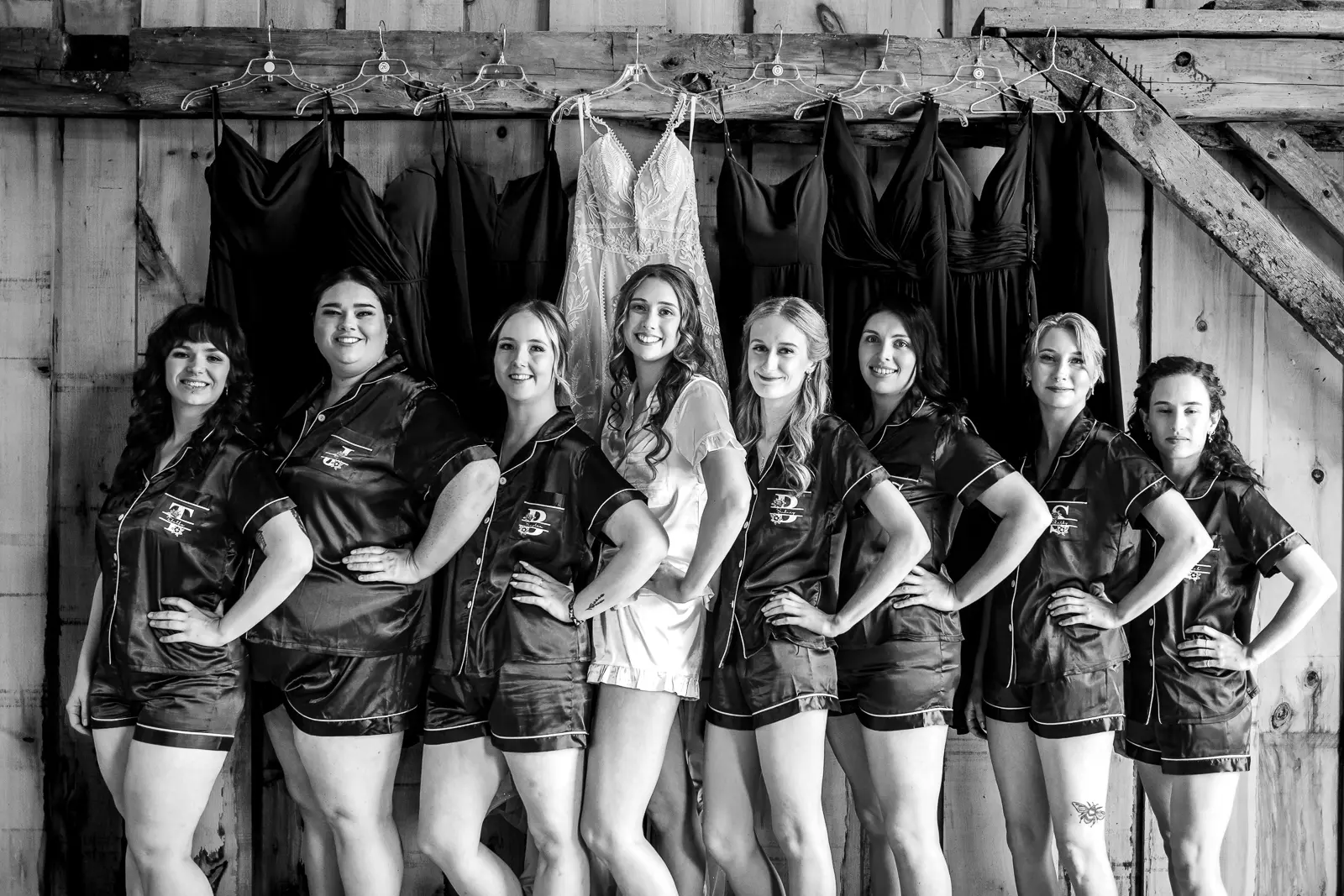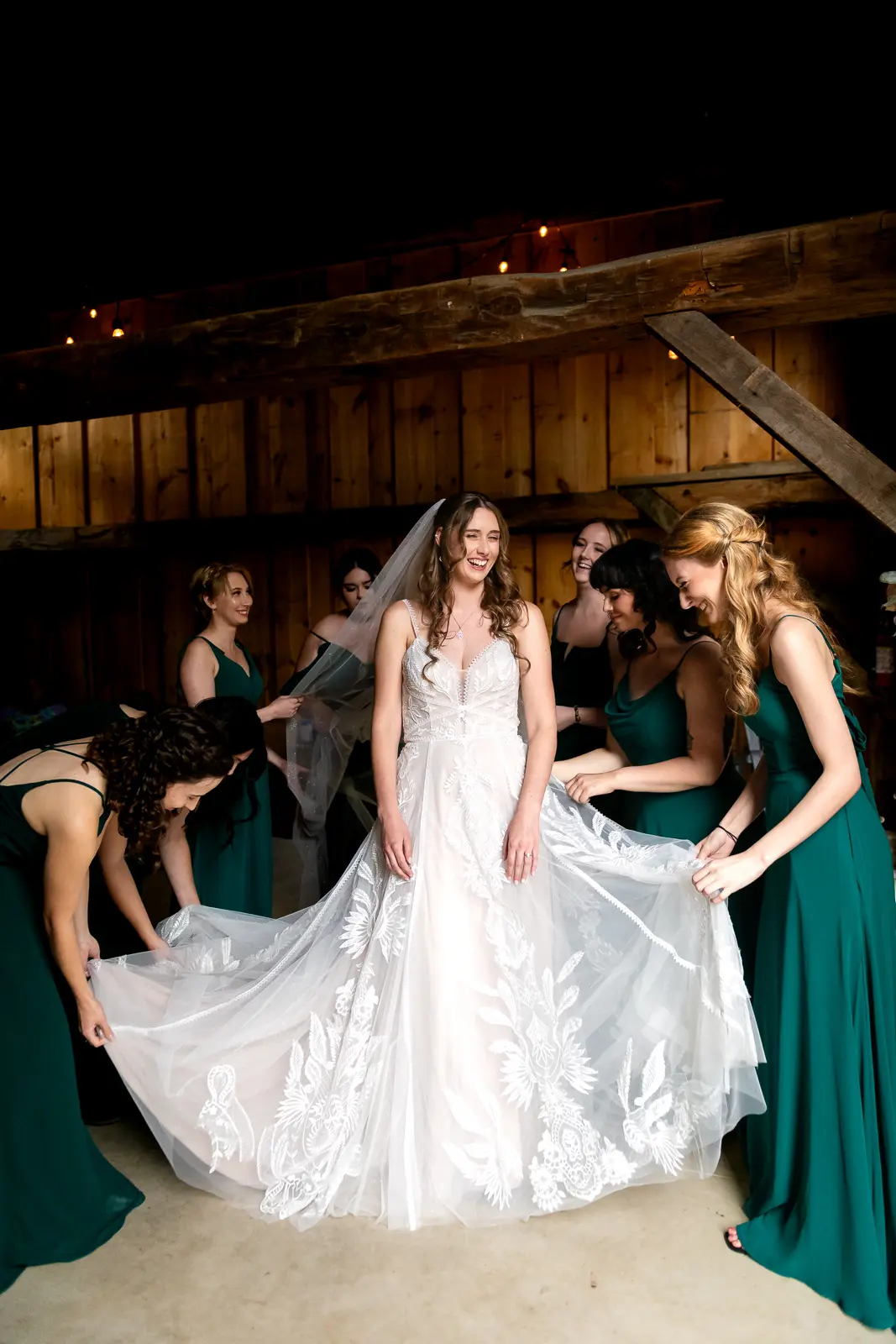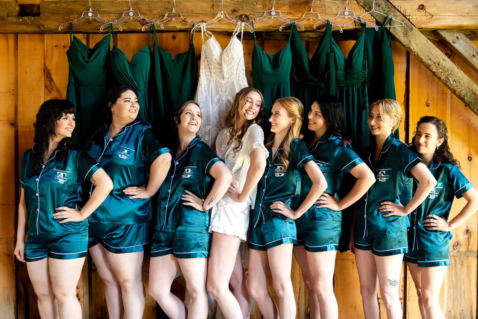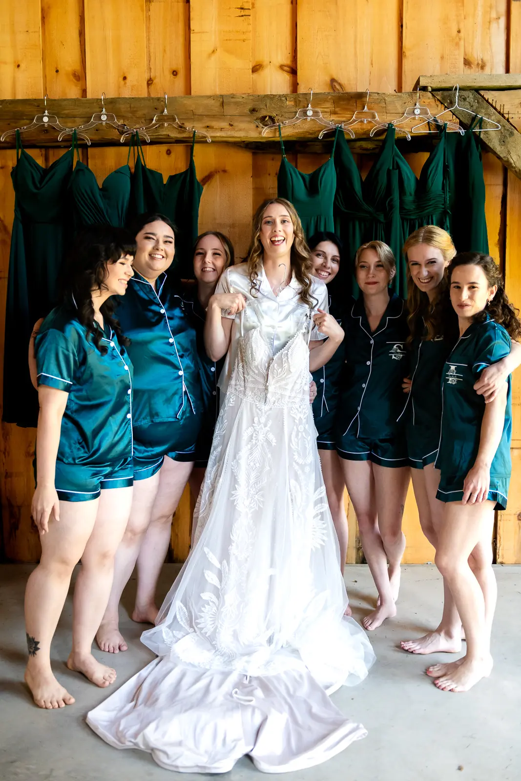 The morning started in the barn where Jessica and the ladies got ready together. It was the kind of space that instantly sets the tone for the day. Rustic, light-filled, and full of energy. There was music playing, stories being shared, and a lot of laughter as everyone moved through hair, makeup, and final touches. At one point, the group stepped outside the barn and popped champagne together, glasses raised and bubbles flying. It was joyful and unscripted and exactly the kind of moment that makes getting ready photos feel alive.