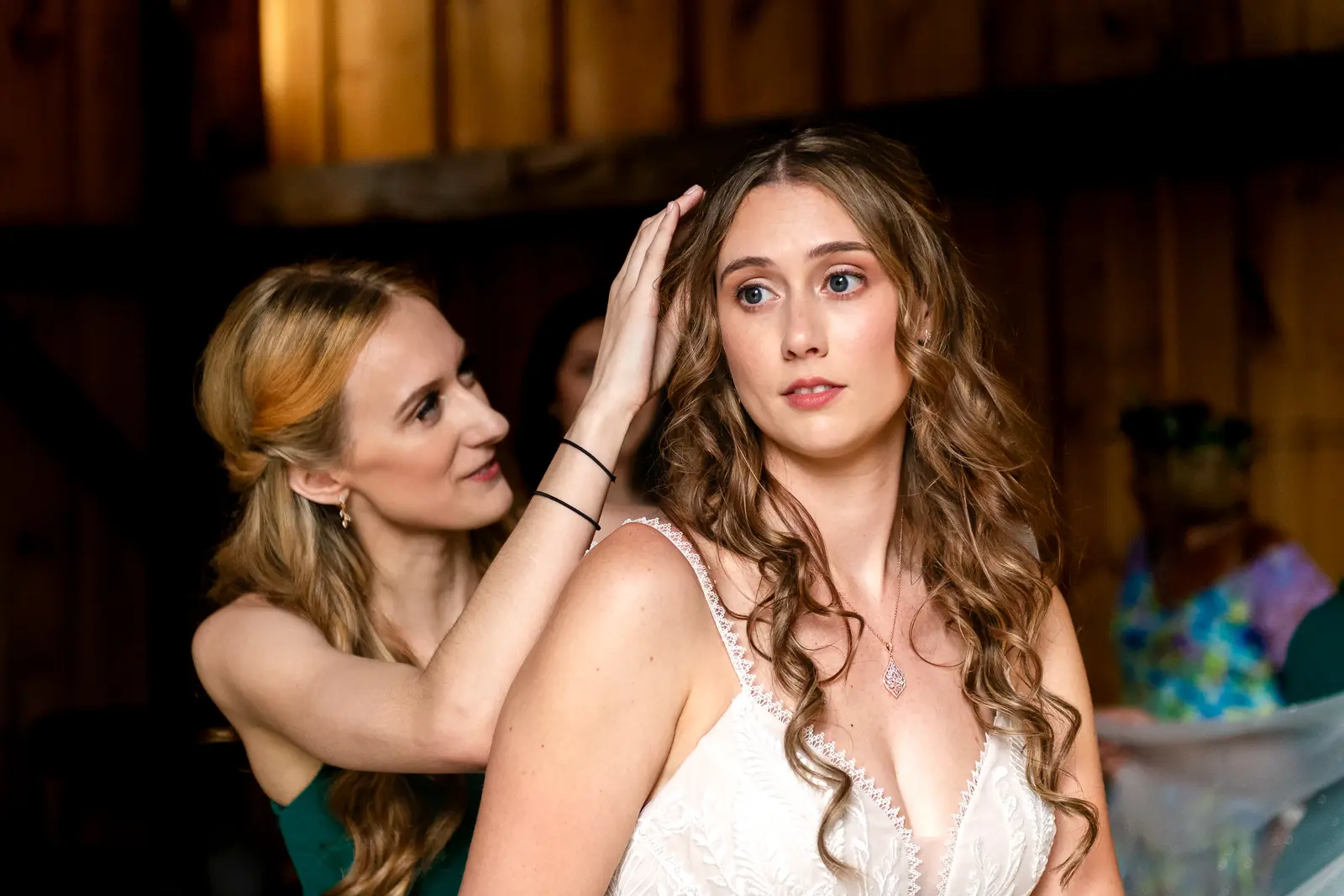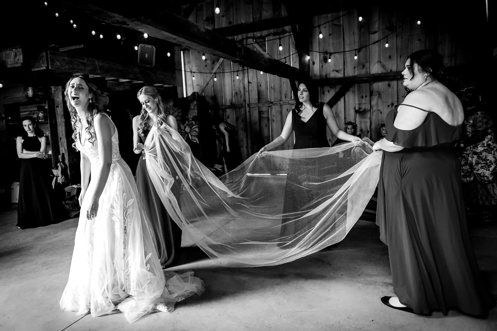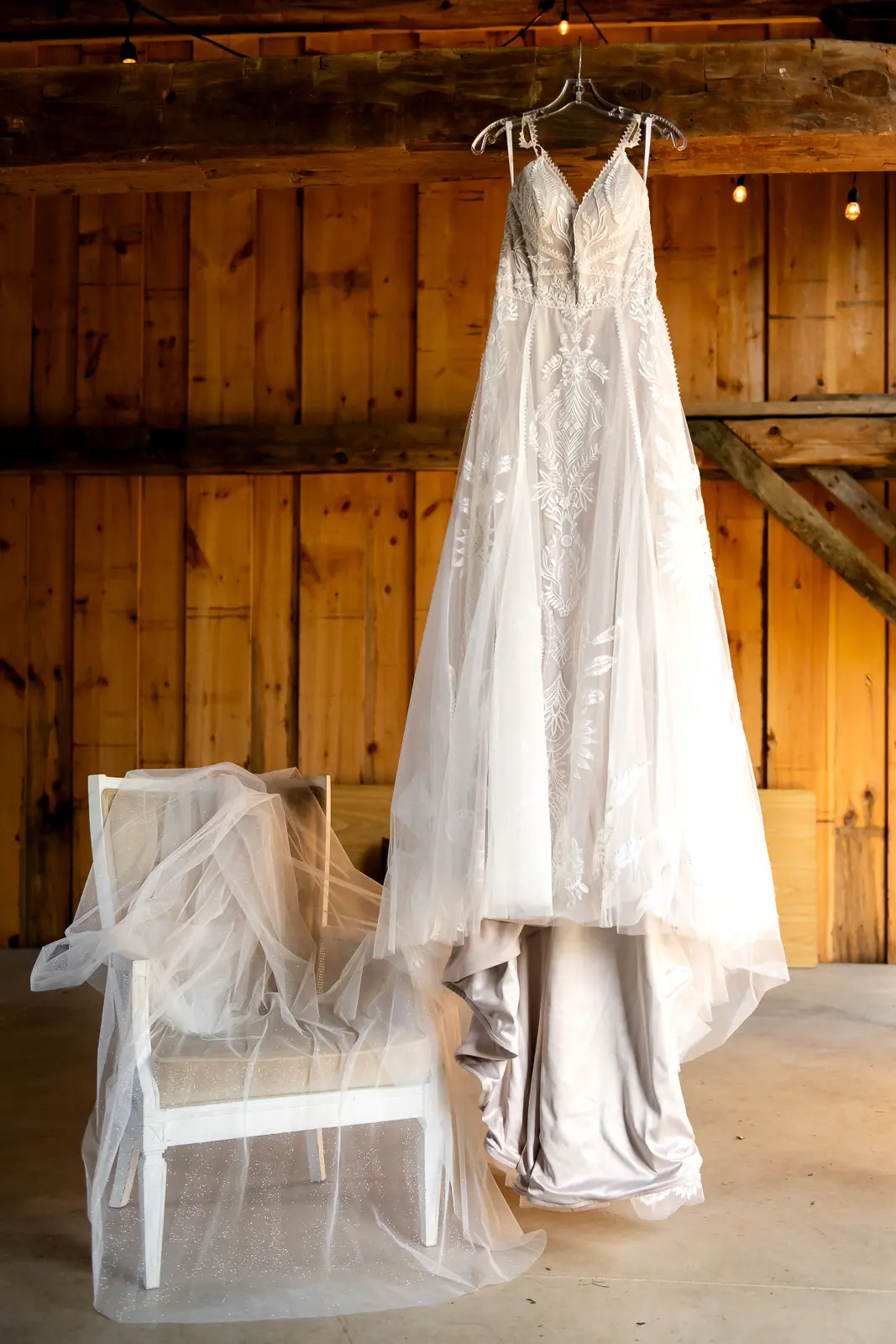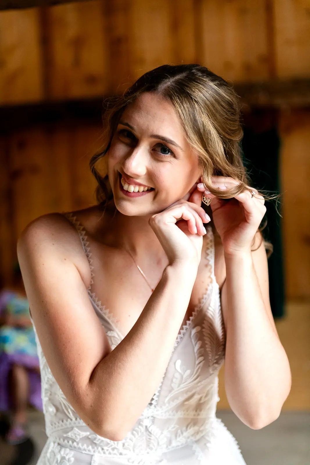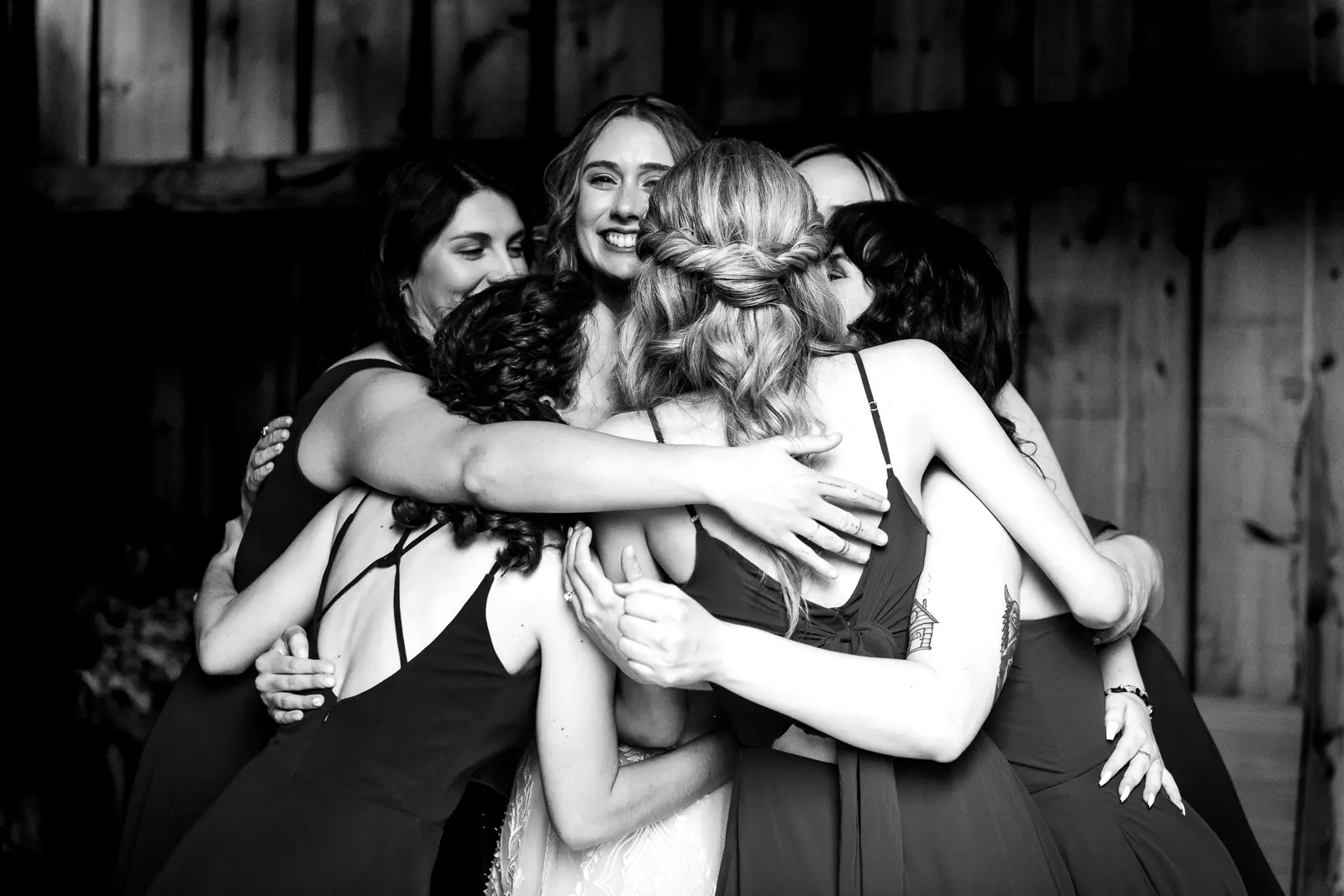 The morning started in the barn where Jessica and the ladies got ready together. It was the kind of space that instantly sets the tone for the day. Rustic, light-filled, and full of energy. There was music playing, stories being shared, and a lot of laughter as everyone moved through hair, makeup, and final touches. At one point, the group stepped outside the barn and popped champagne together, glasses raised and bubbles flying. It was joyful and unscripted and exactly the kind of moment that makes getting ready photos feel alive.