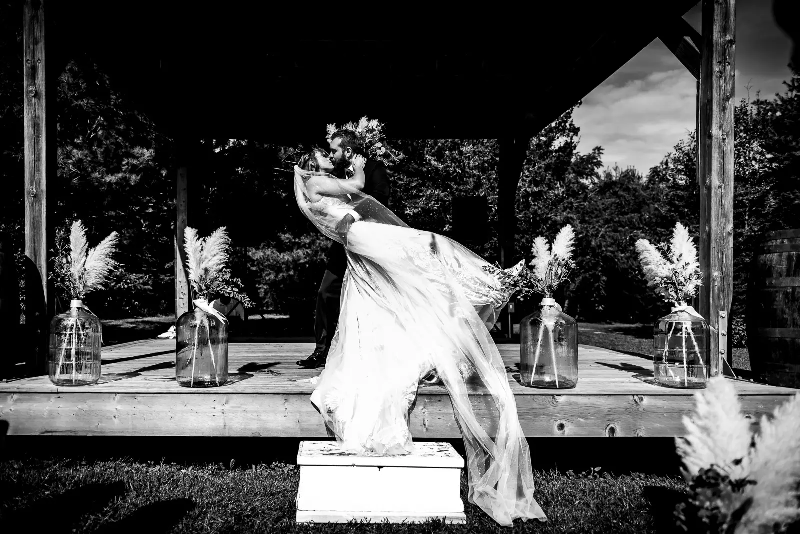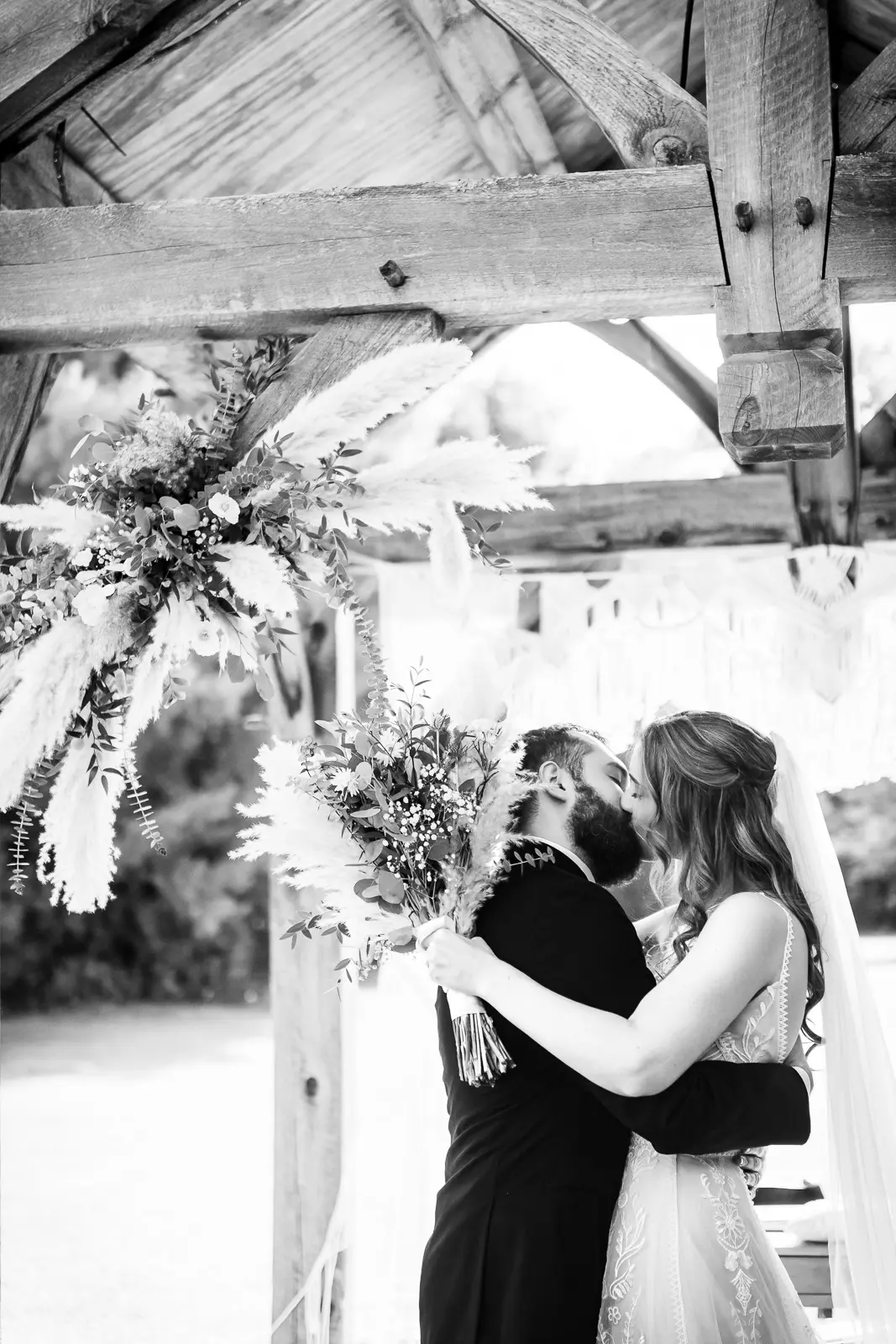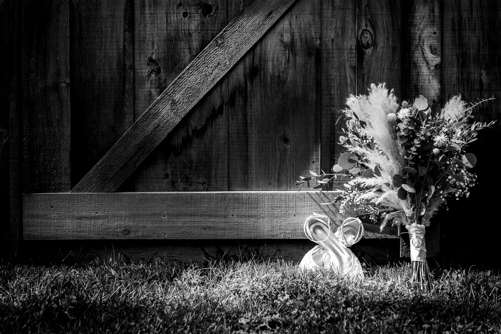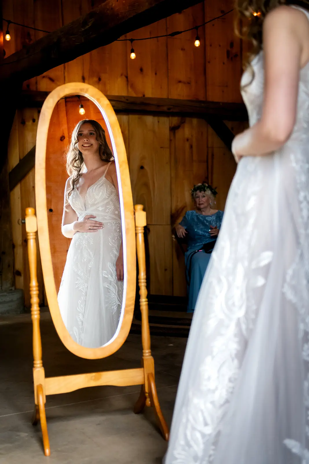 The morning started in the barn where Jessica and the ladies got ready together. It was the kind of space that instantly sets the tone for the day. Rustic, light-filled, and full of energy. There was music playing, stories being shared, and a lot of laughter as everyone moved through hair, makeup, and final touches. At one point, the group stepped outside the barn and popped champagne together, glasses raised and bubbles flying. It was joyful and unscripted and exactly the kind of moment that makes getting ready photos feel alive.