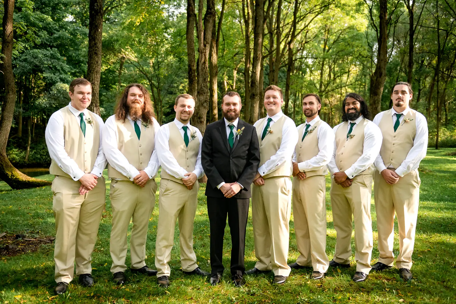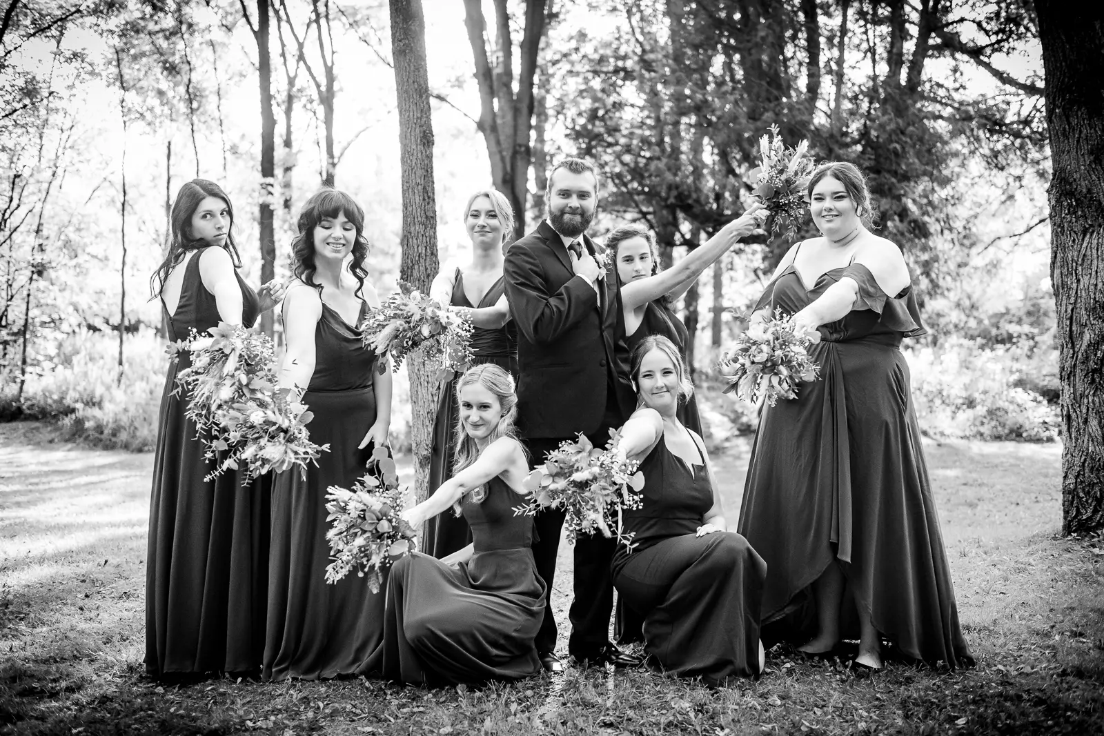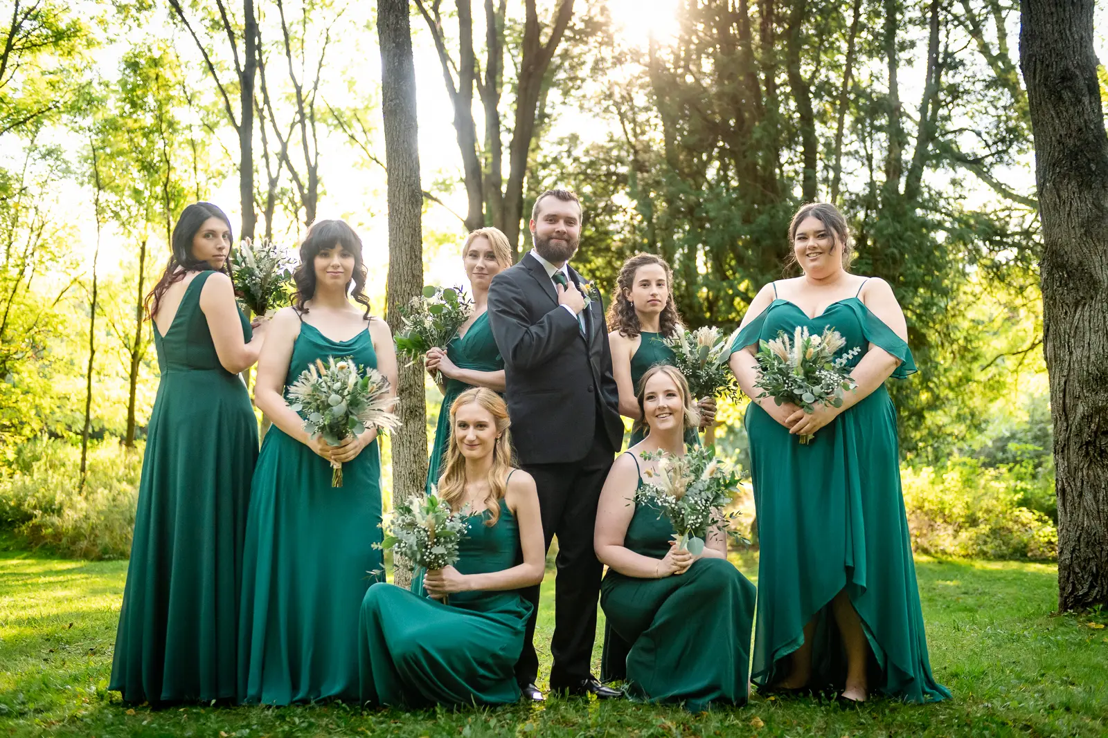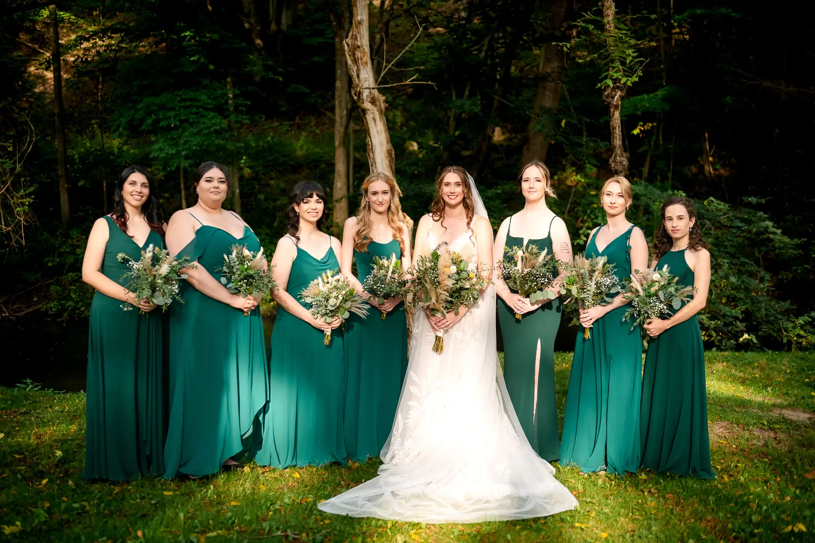 We then headed into the woods for bridal party and couple portraits. Homegrown Hideaway is ideal for this. A river runs nearby, and as the sun dipped lower, light splashed beautifully through the trees, wrapping everyone in a soft golden glow. The mix of forest, water, and warm light gave their portraits a timeless, storybook feel.