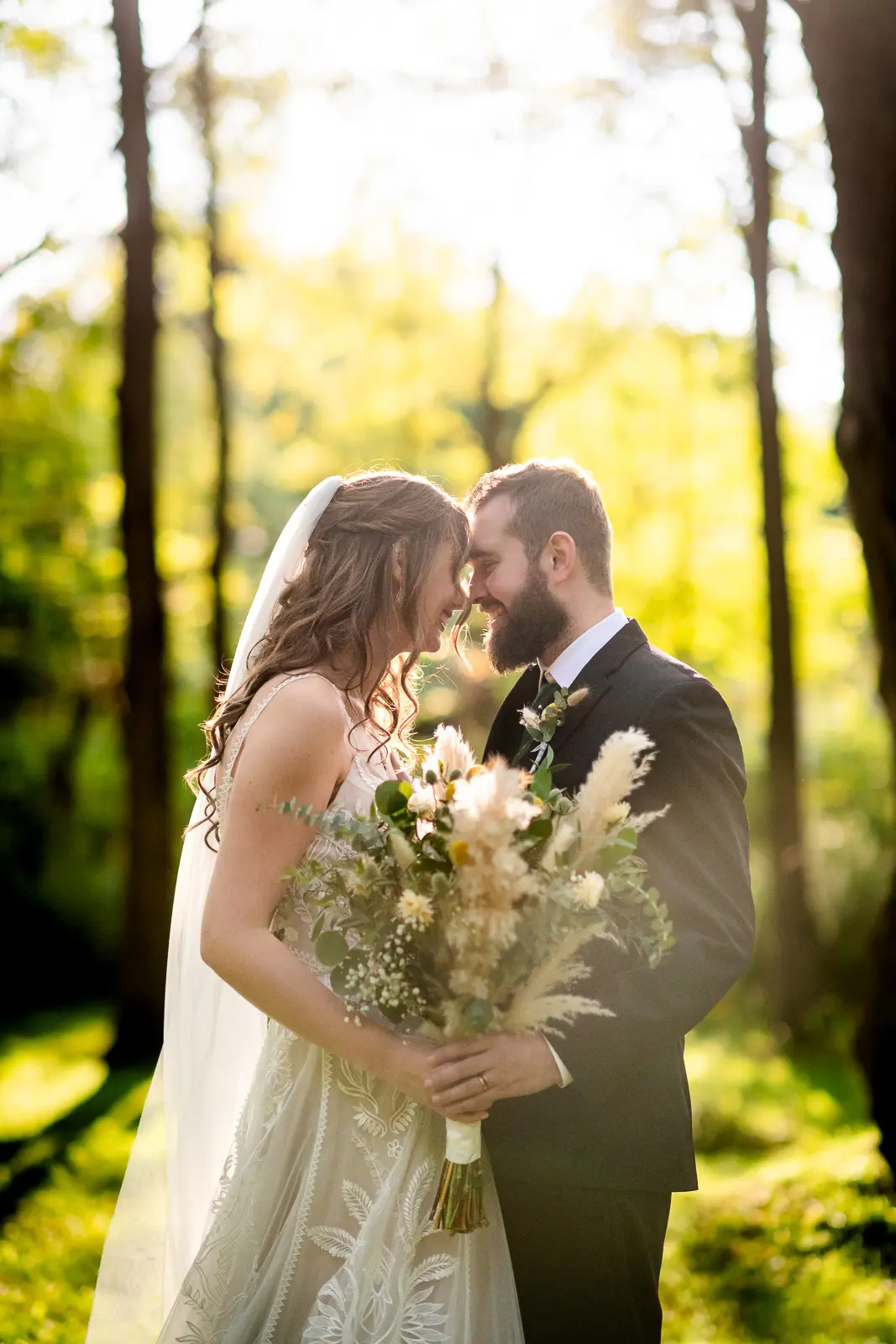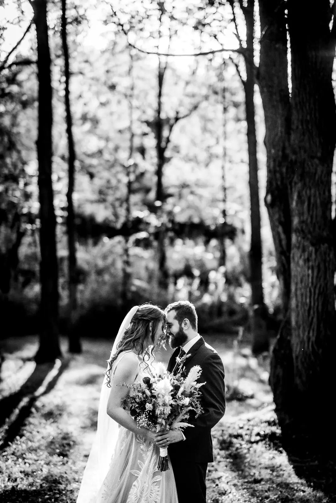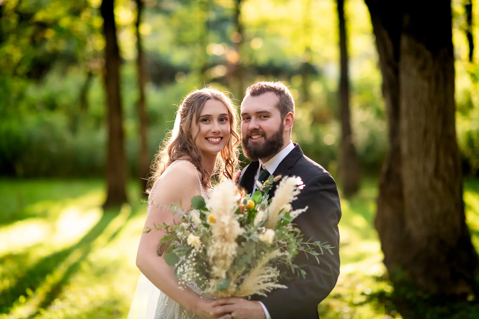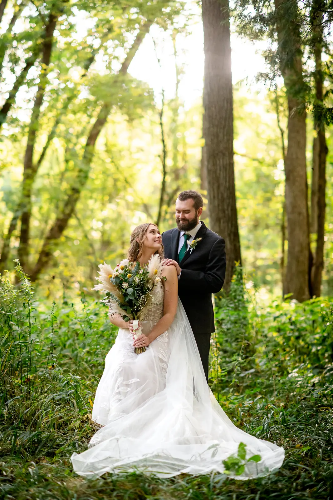We then headed into the woods for bridal party and couple portraits. Homegrown Hideaway is ideal for this. A river runs nearby, and as the sun dipped lower, light splashed beautifully through the trees, wrapping everyone in a soft golden glow. The mix of forest, water, and warm light gave their portraits a timeless, storybook feel.