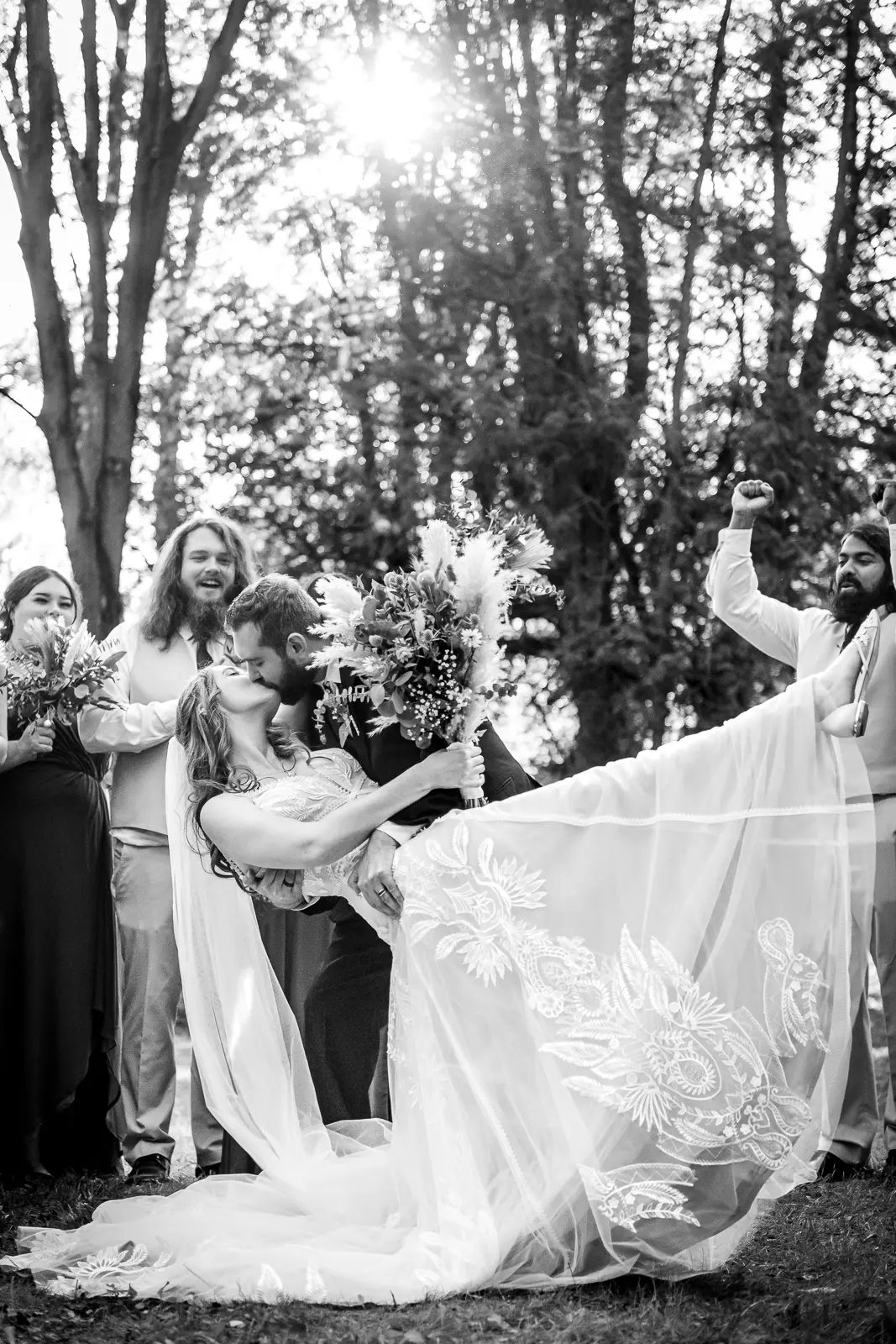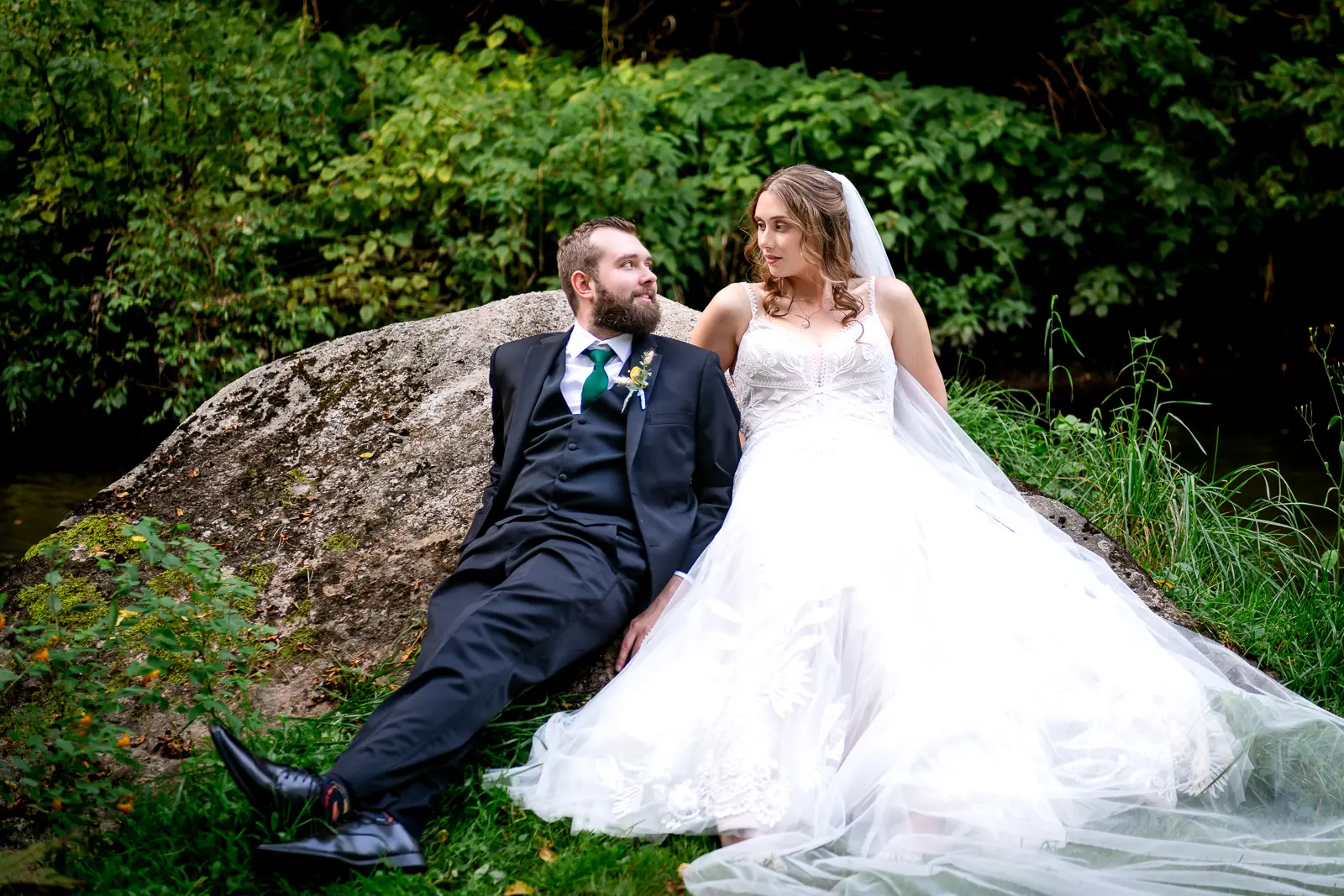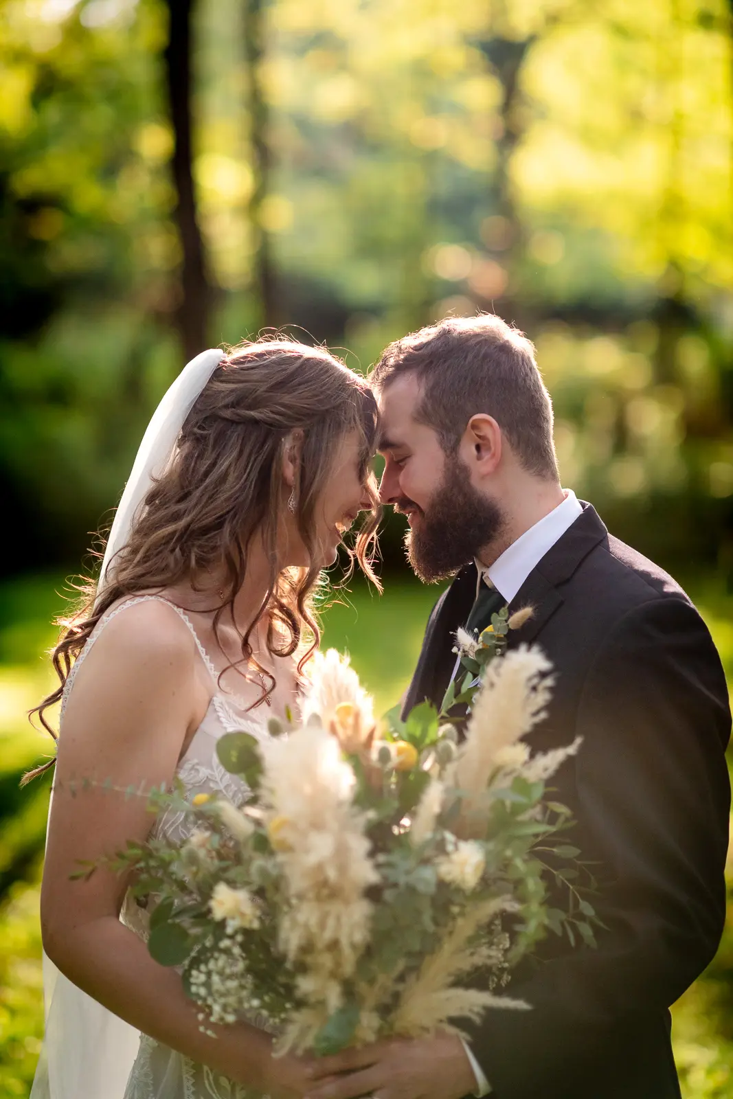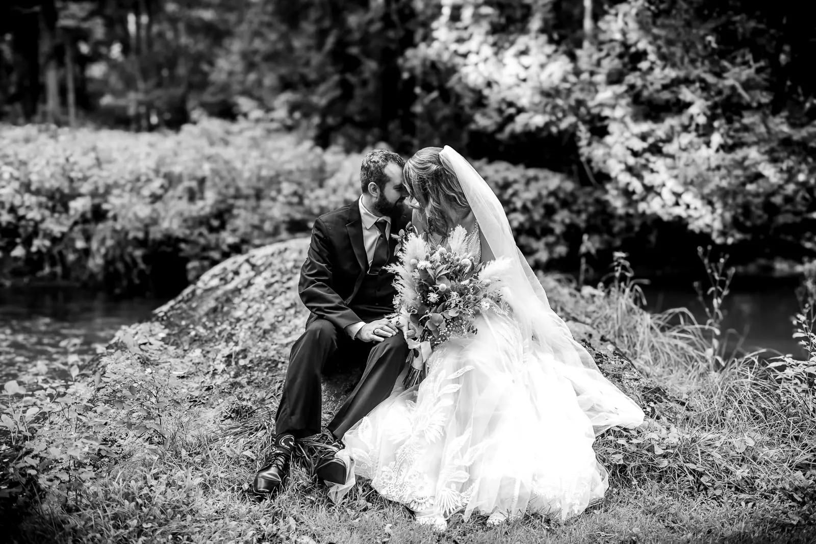 We then headed into the woods for bridal party and couple portraits. Homegrown Hideaway is ideal for this. A river runs nearby, and as the sun dipped lower, light splashed beautifully through the trees, wrapping everyone in a soft golden glow. The mix of forest, water, and warm light gave their portraits a timeless, storybook feel.