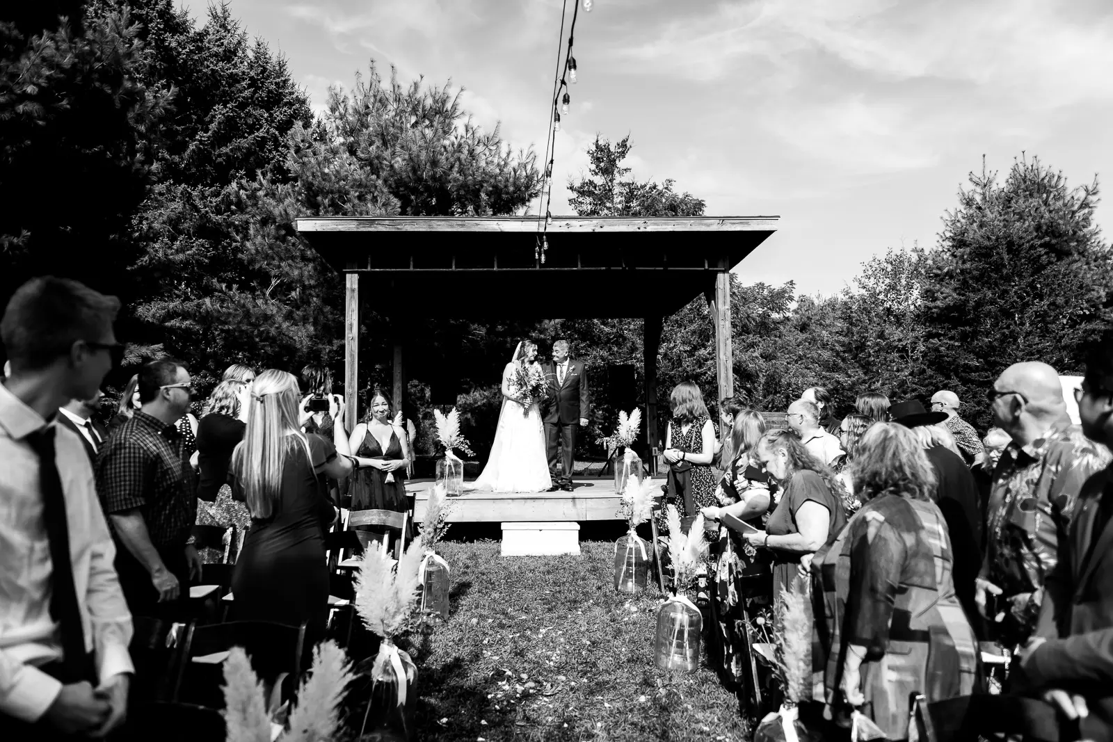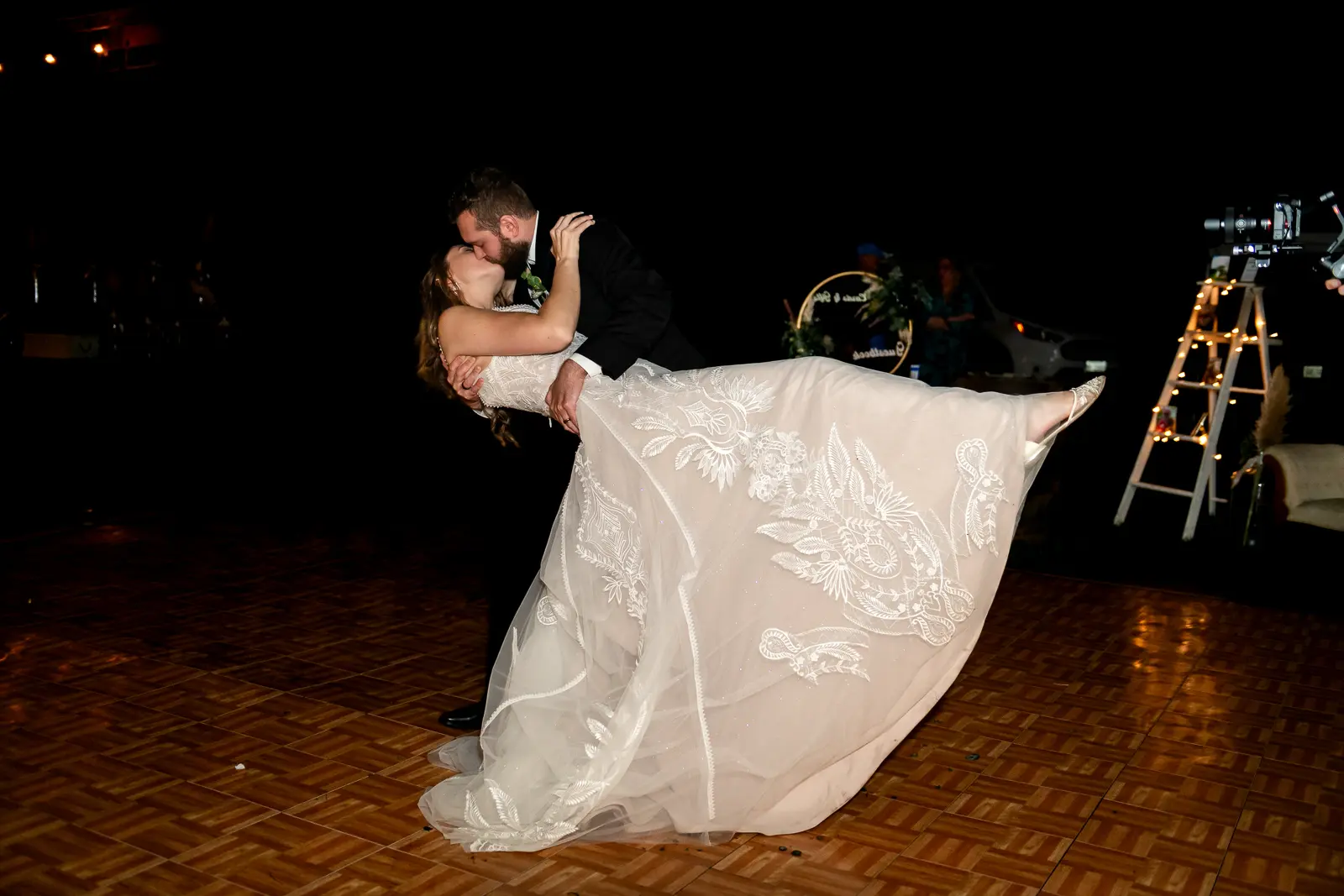 As night fell, the reception came to life under the tent. Jessica and Nathan shared their first dance outside in the darkness, surrounded by twinkle lights and the quiet of the woods. It felt intimate and cinematic, like the world had narrowed down to just the two of them for that song.