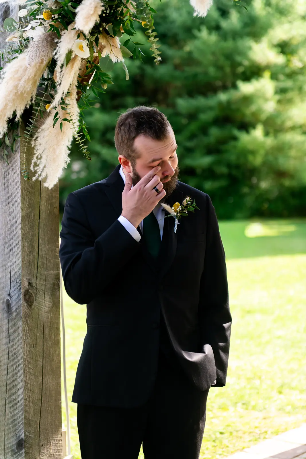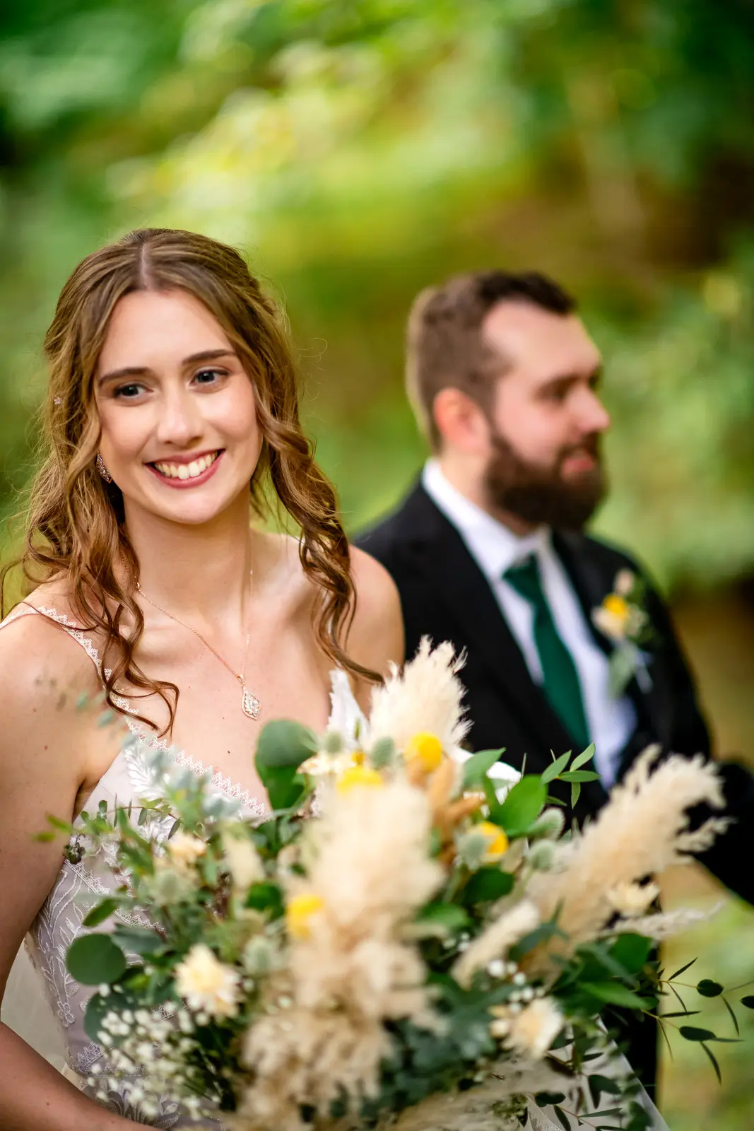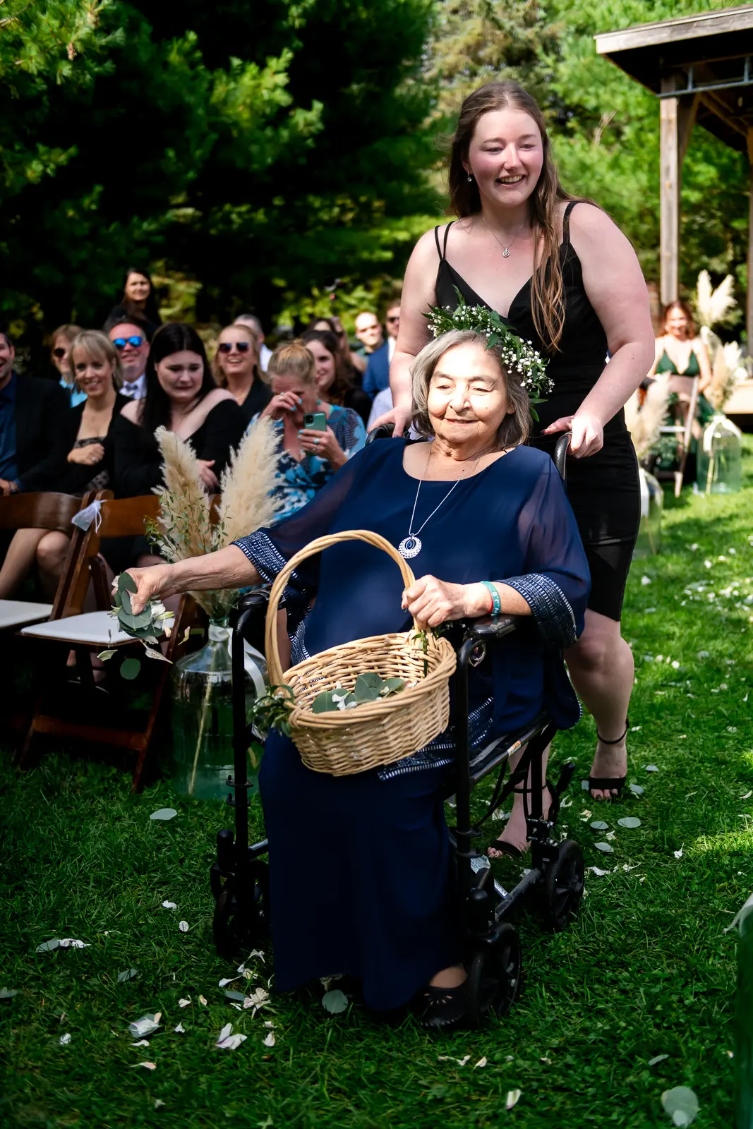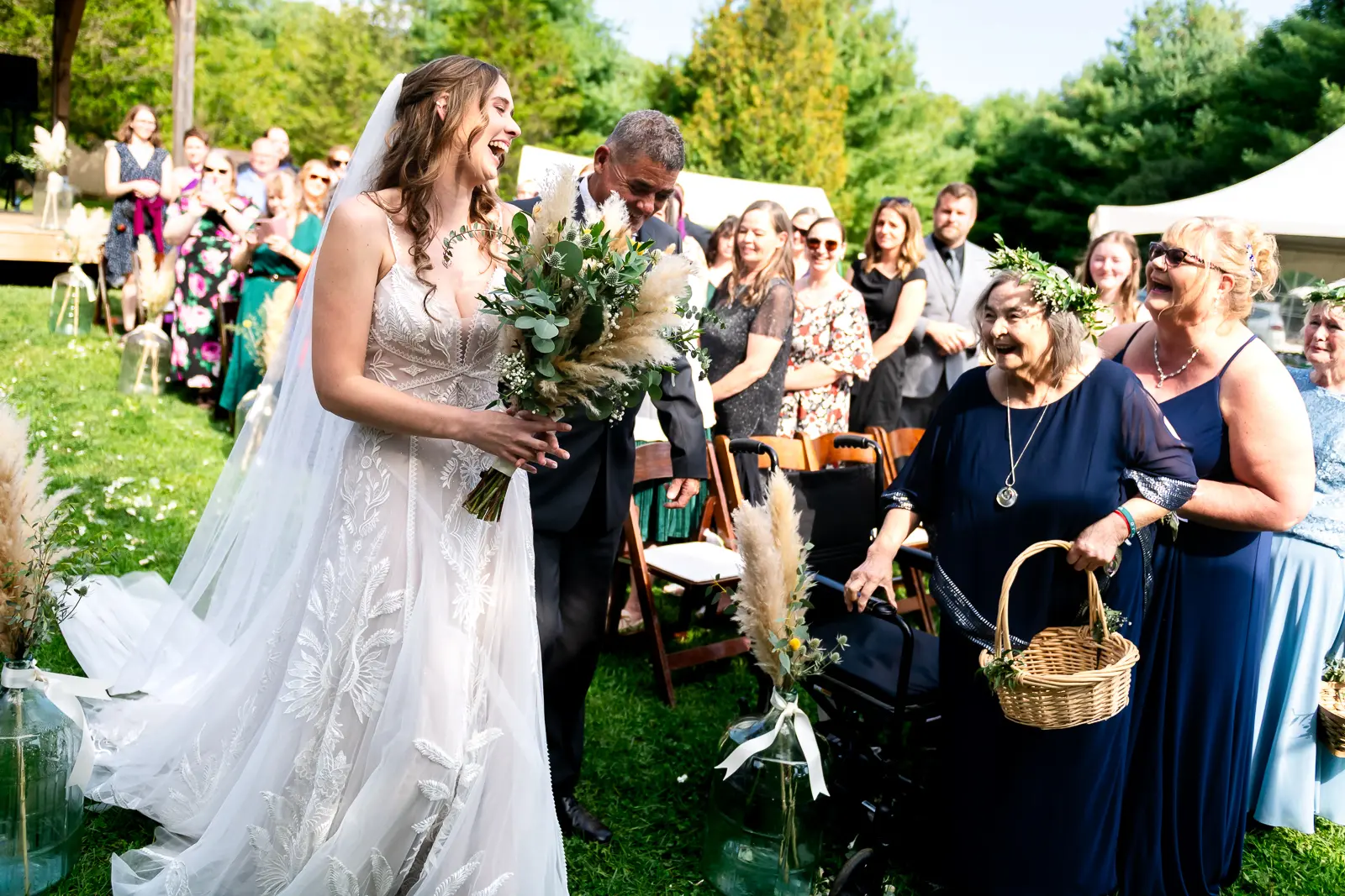 The ceremony was held surrounded by trees, with sunlight filtering through the leaves. One of the most memorable touches was the flower grannies, who brought smiles to everyone’s faces as they made their way down the aisle. When Jessica walked in, Nathan’s reaction said everything. He was visibly emotional, taking in the moment as she approached, and it set a deeply heartfelt tone for the ceremony that followed.