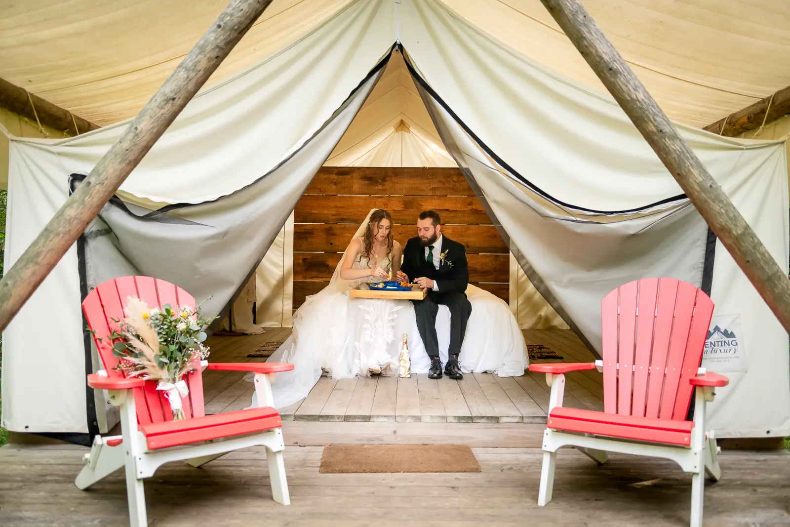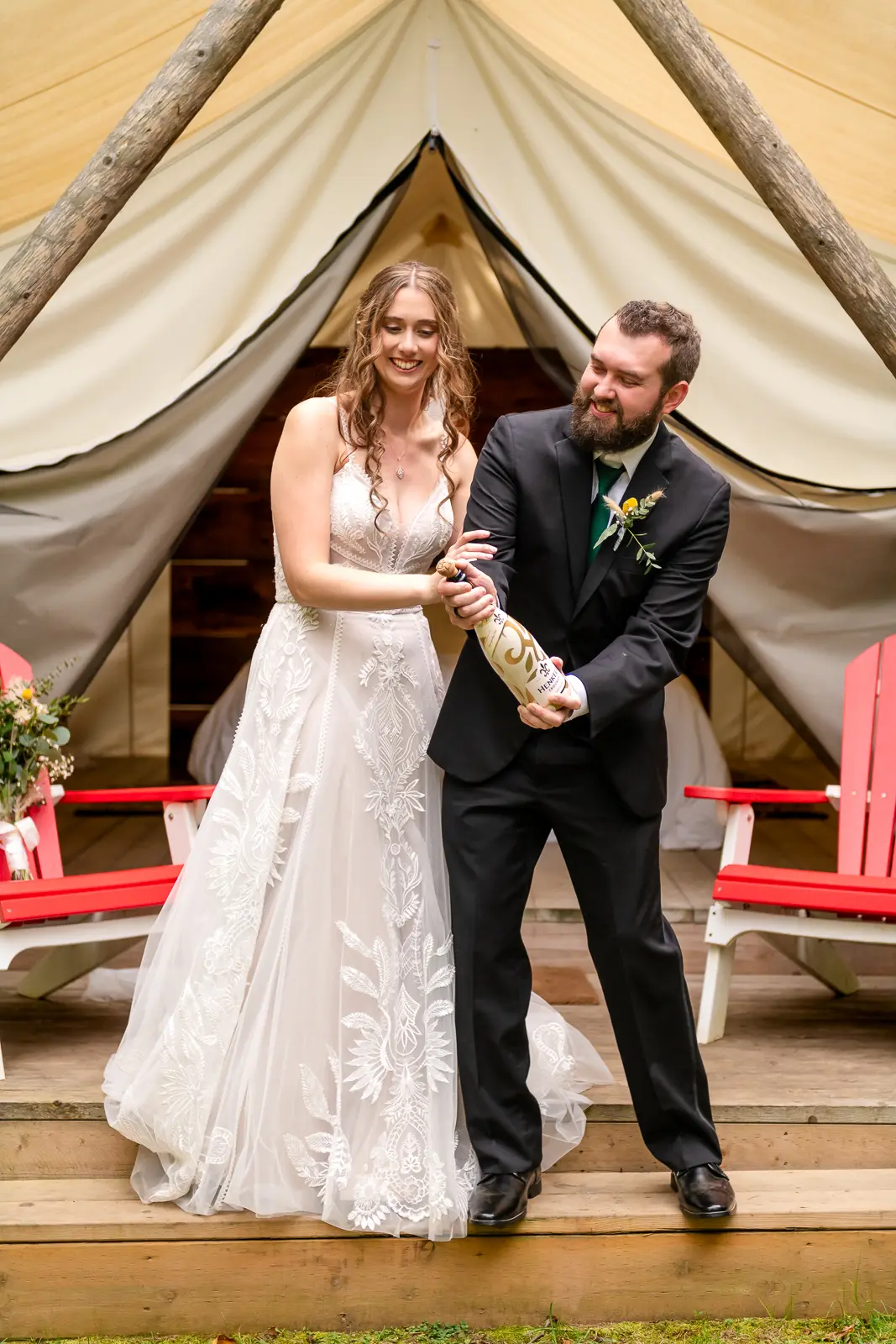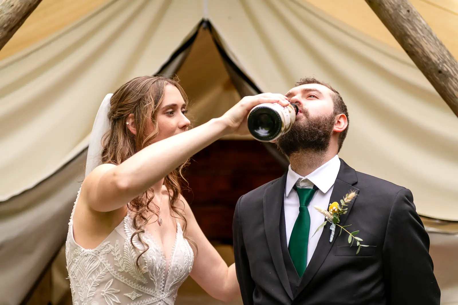 After the ceremony, Jessica and Nathan took a quiet breather together in one of the glamping tents. Just the two of them, a charcuterie board, and a moment to let everything sink in. They popped a bottle of champagne outside the tent and relaxed before rejoining their guests. It was such a perfect reflection of the day. Unrushed, personal, and centered on being present together. Those moments also made for some incredibly intimate and meaningful photos.