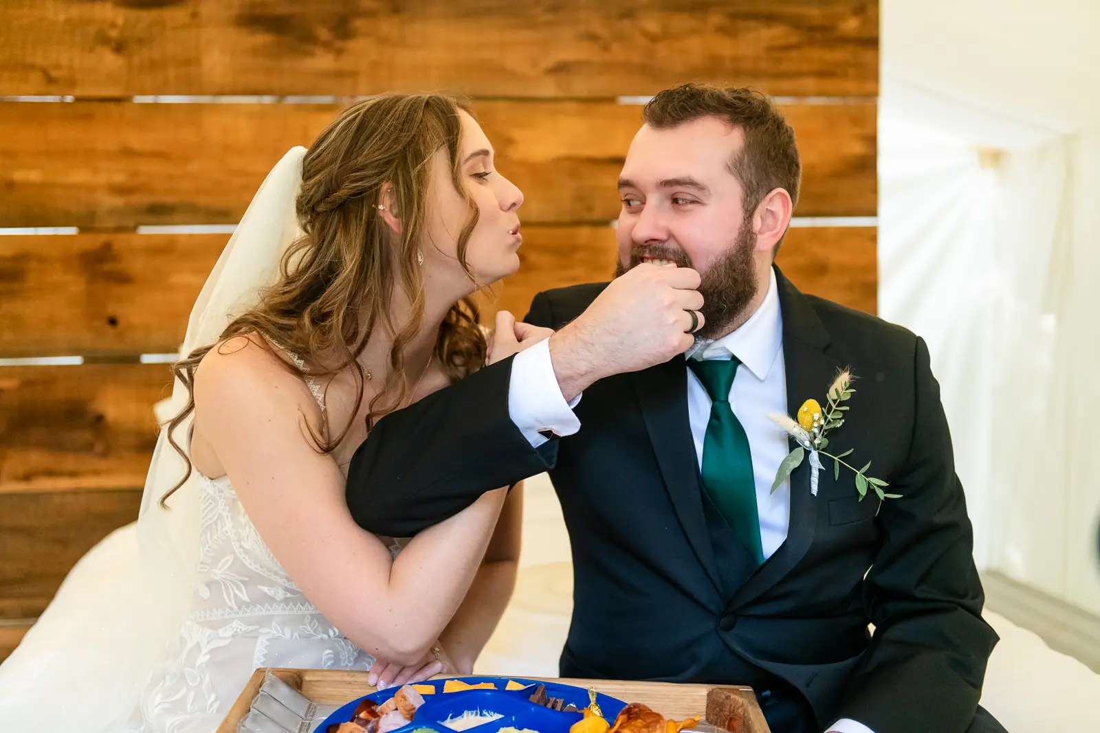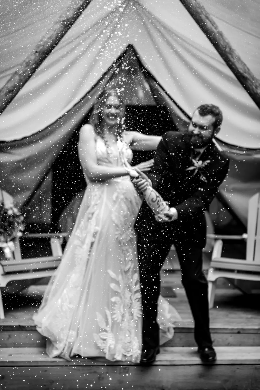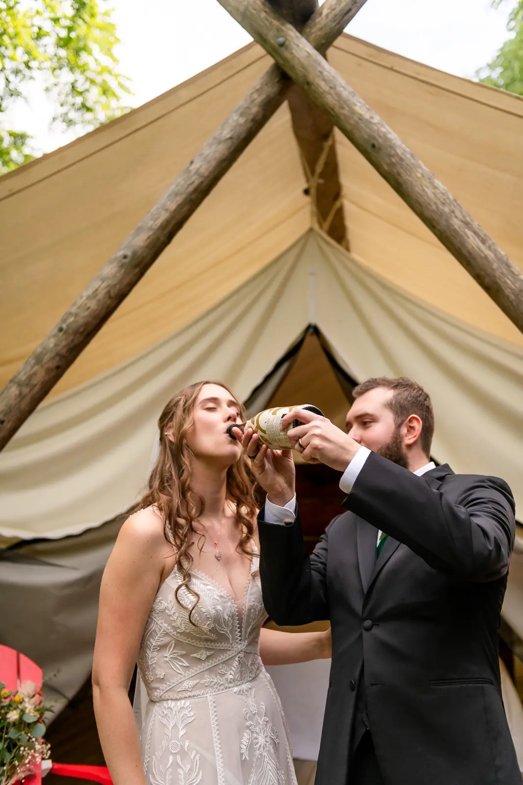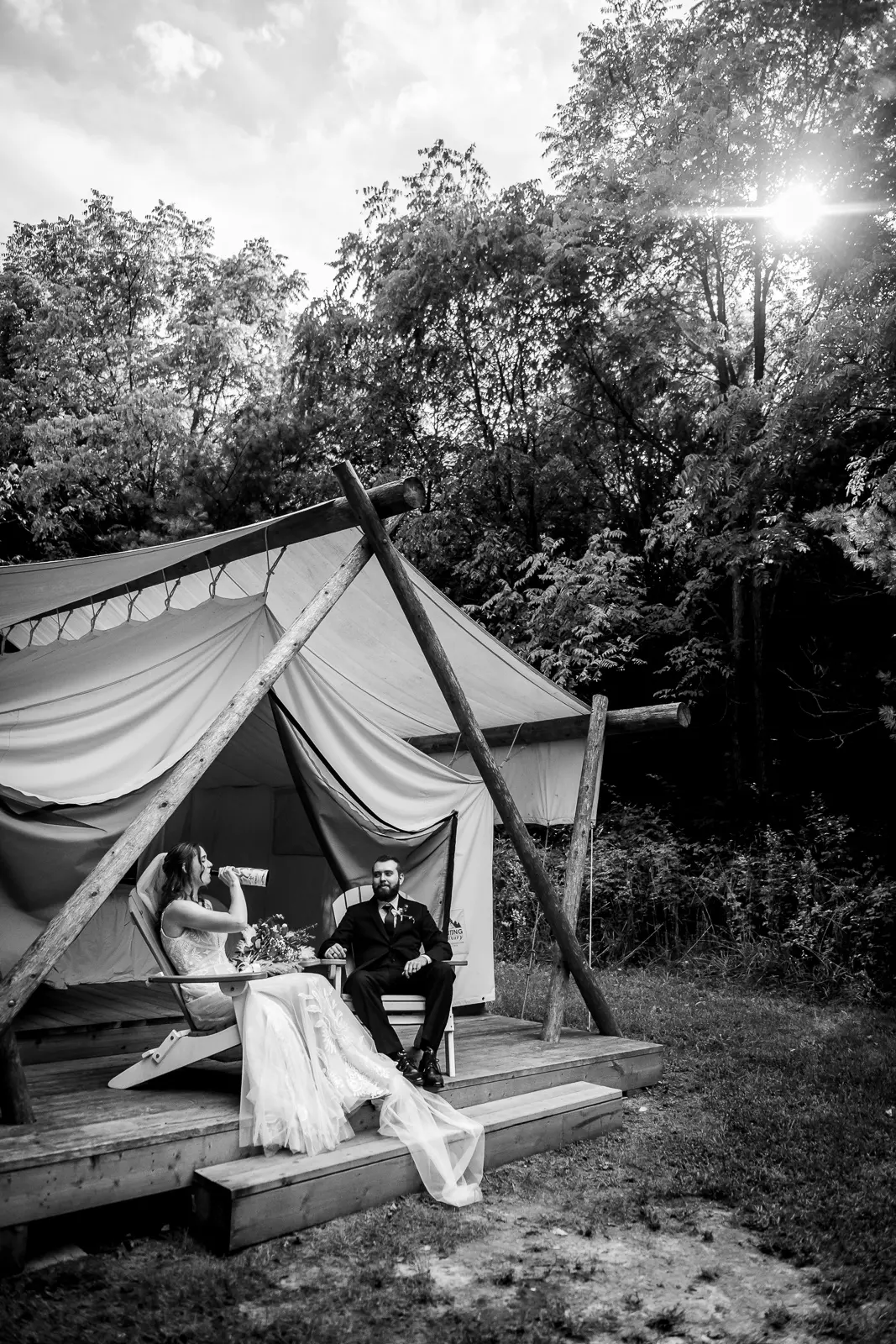 After the ceremony, Jessica and Nathan took a quiet breather together in one of the glamping tents. Just the two of them, a charcuterie board, and a moment to let everything sink in. They popped a bottle of champagne outside the tent and relaxed before rejoining their guests. It was such a perfect reflection of the day. Unrushed, personal, and centered on being present together. Those moments also made for some incredibly intimate and meaningful photos.