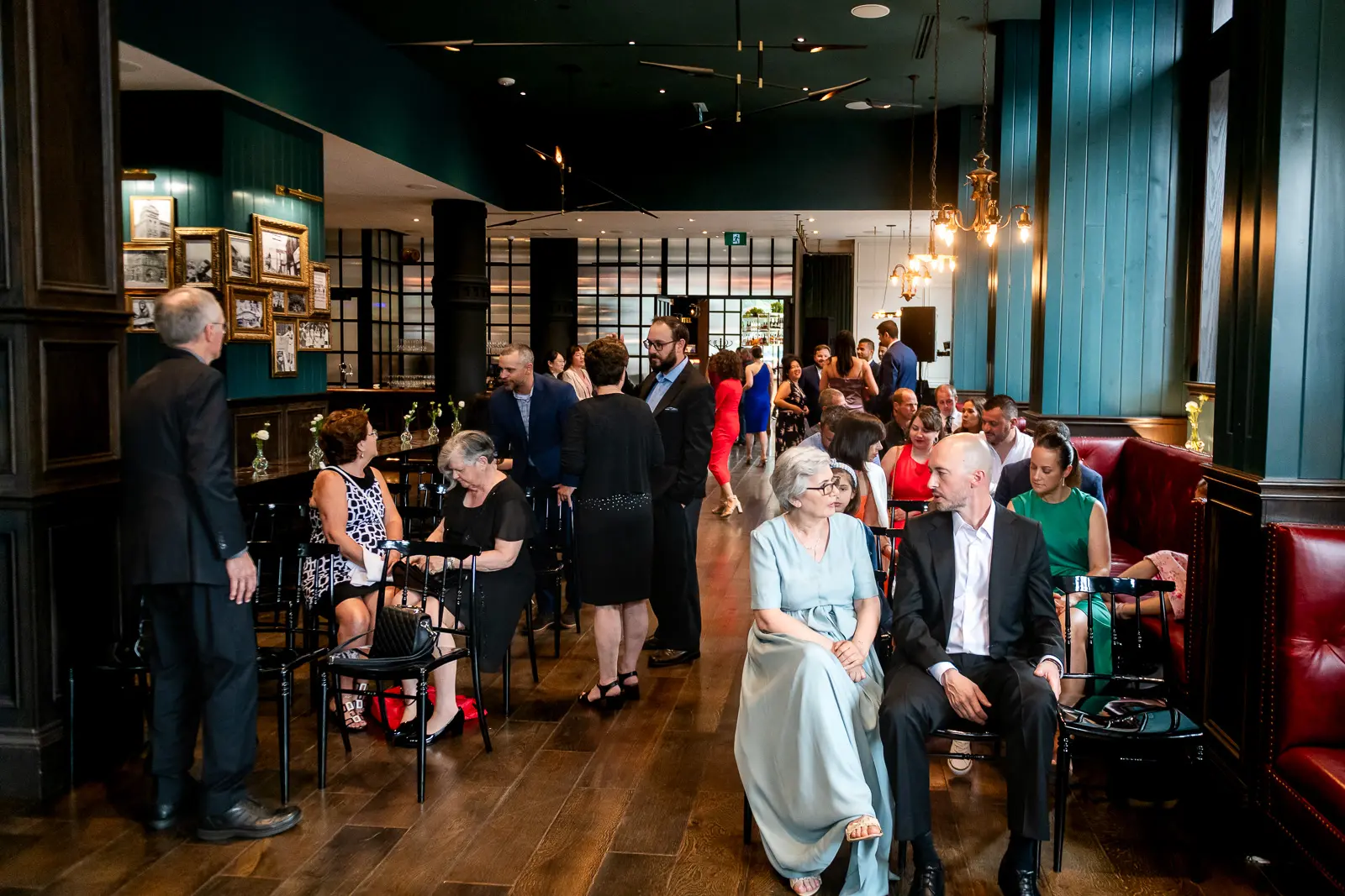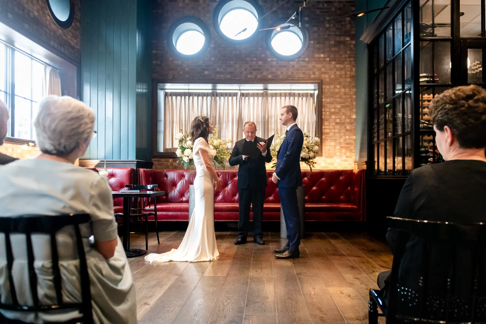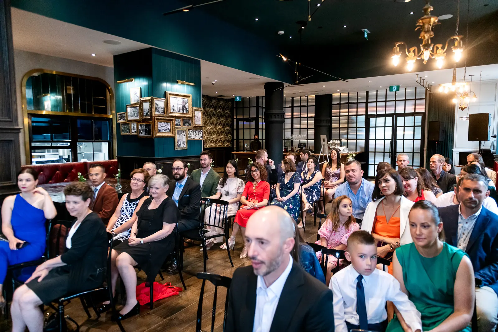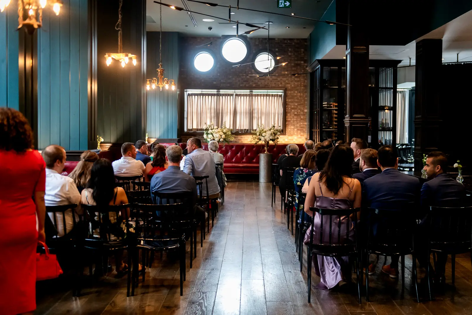 The space had been transformed completely—tables cleared and replaced with ceremony seating, allowing the room to breathe differently. The lighting was low and atmospheric, with an understated art deco elegance that matched the building’s heritage perfectly.