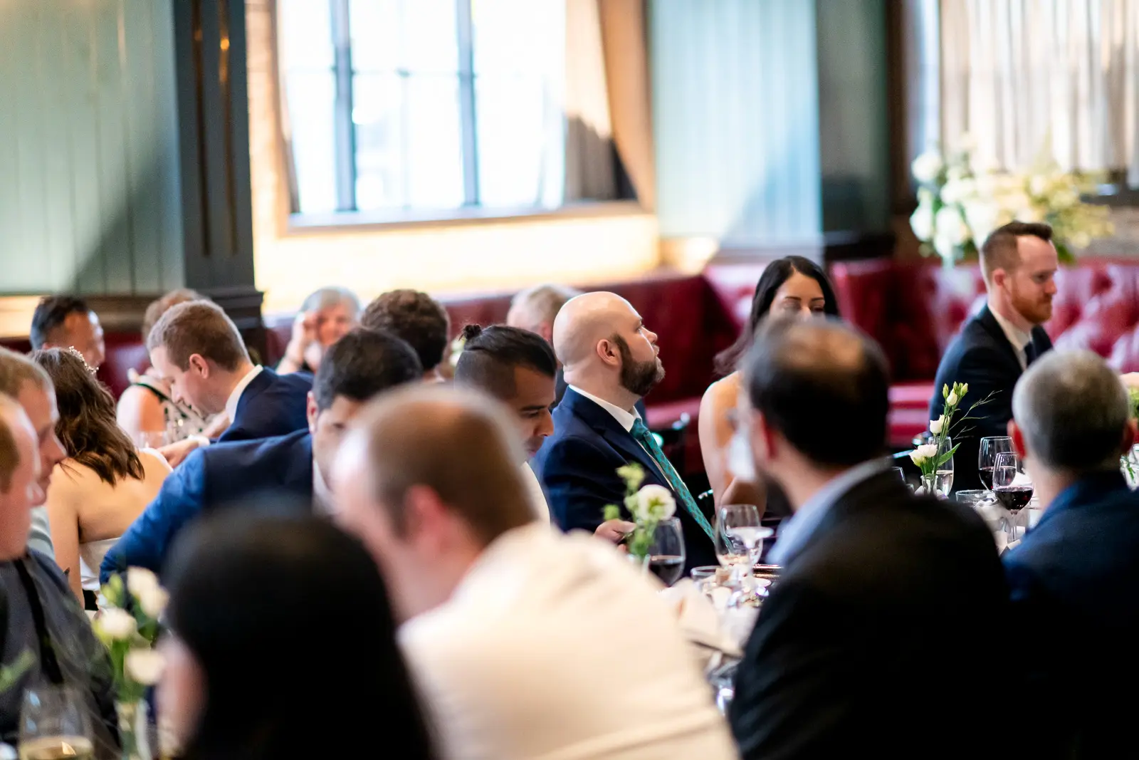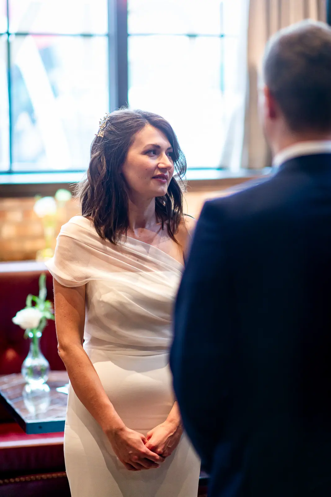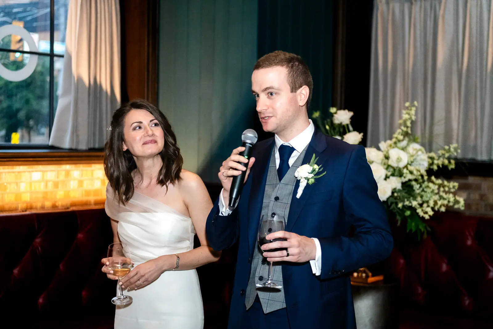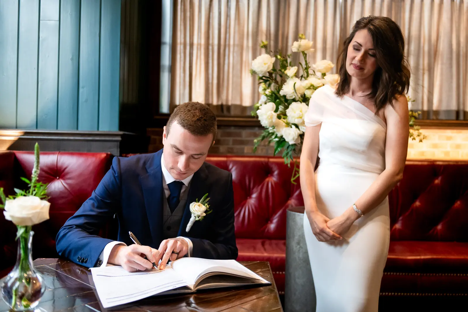 The space had been transformed completely—tables cleared and replaced with ceremony seating, allowing the room to breathe differently. The lighting was low and atmospheric, with an understated art deco elegance that matched the building’s heritage perfectly.
