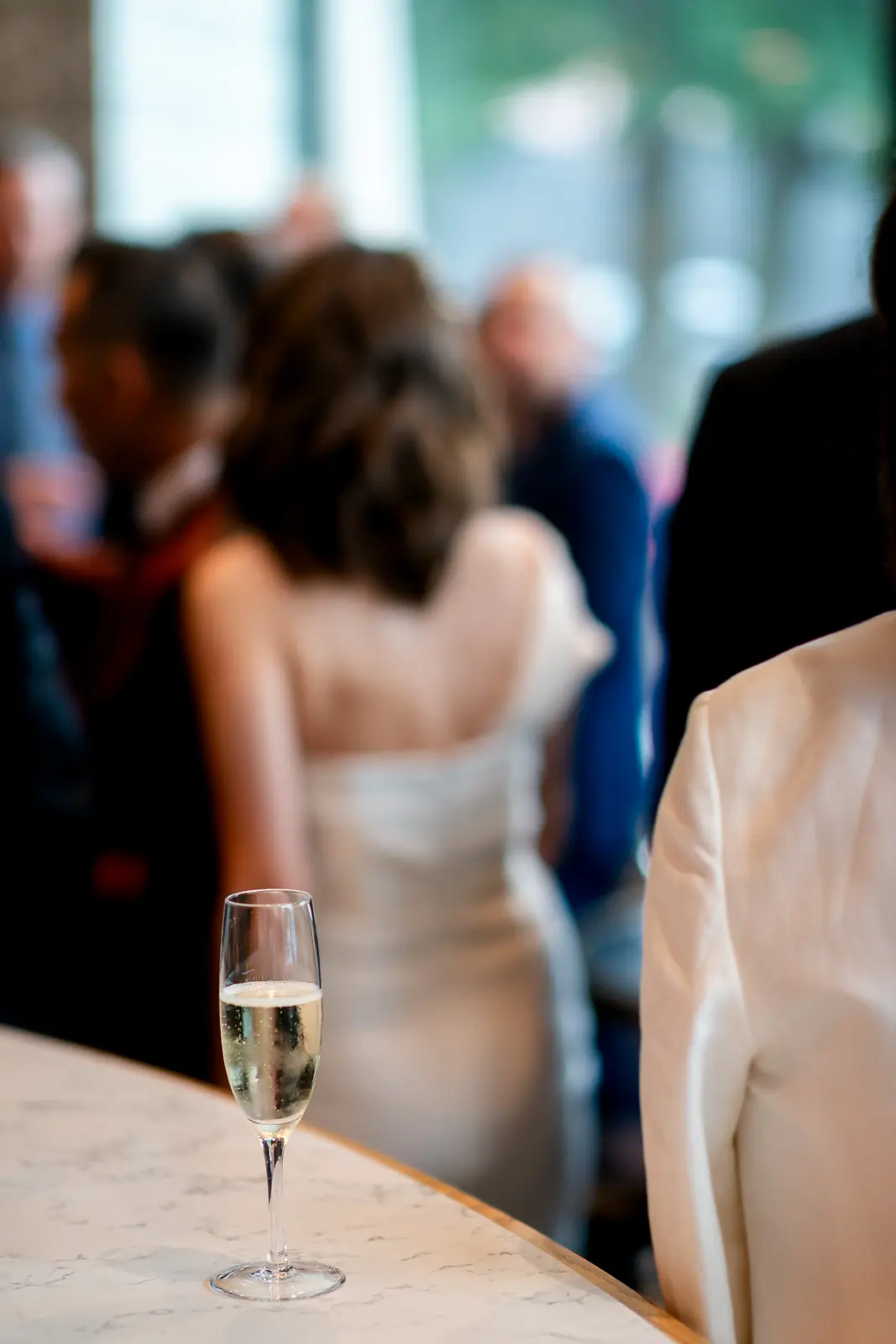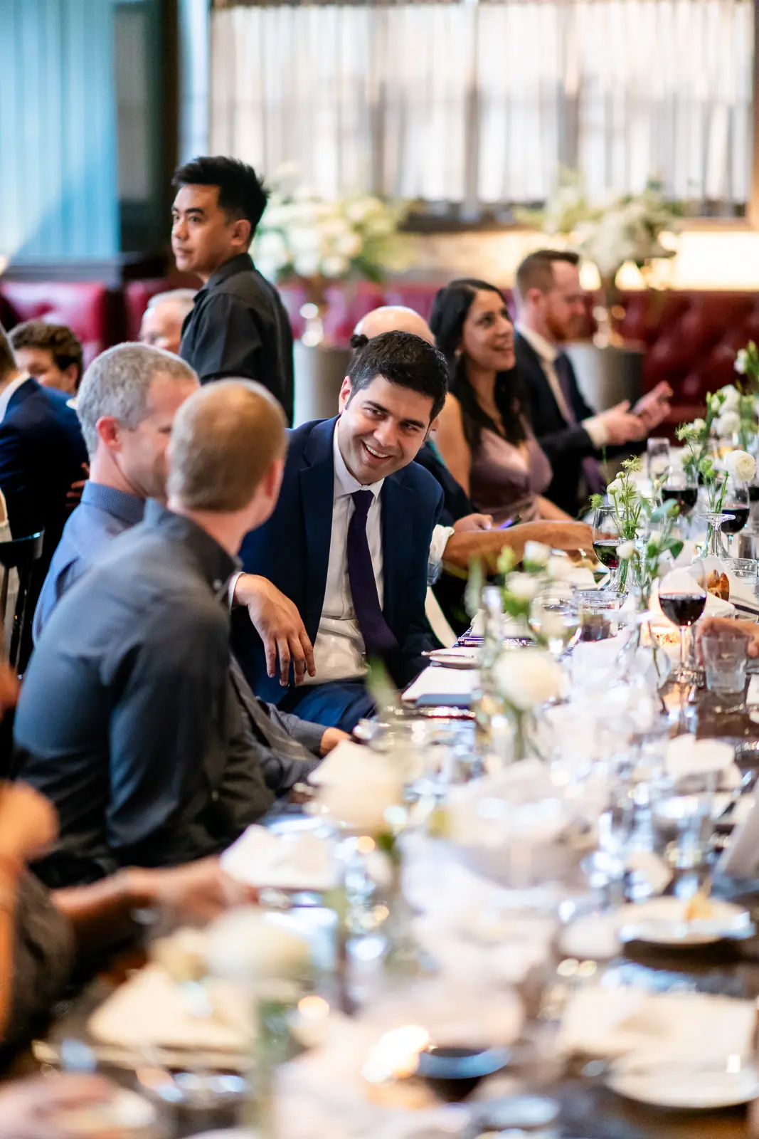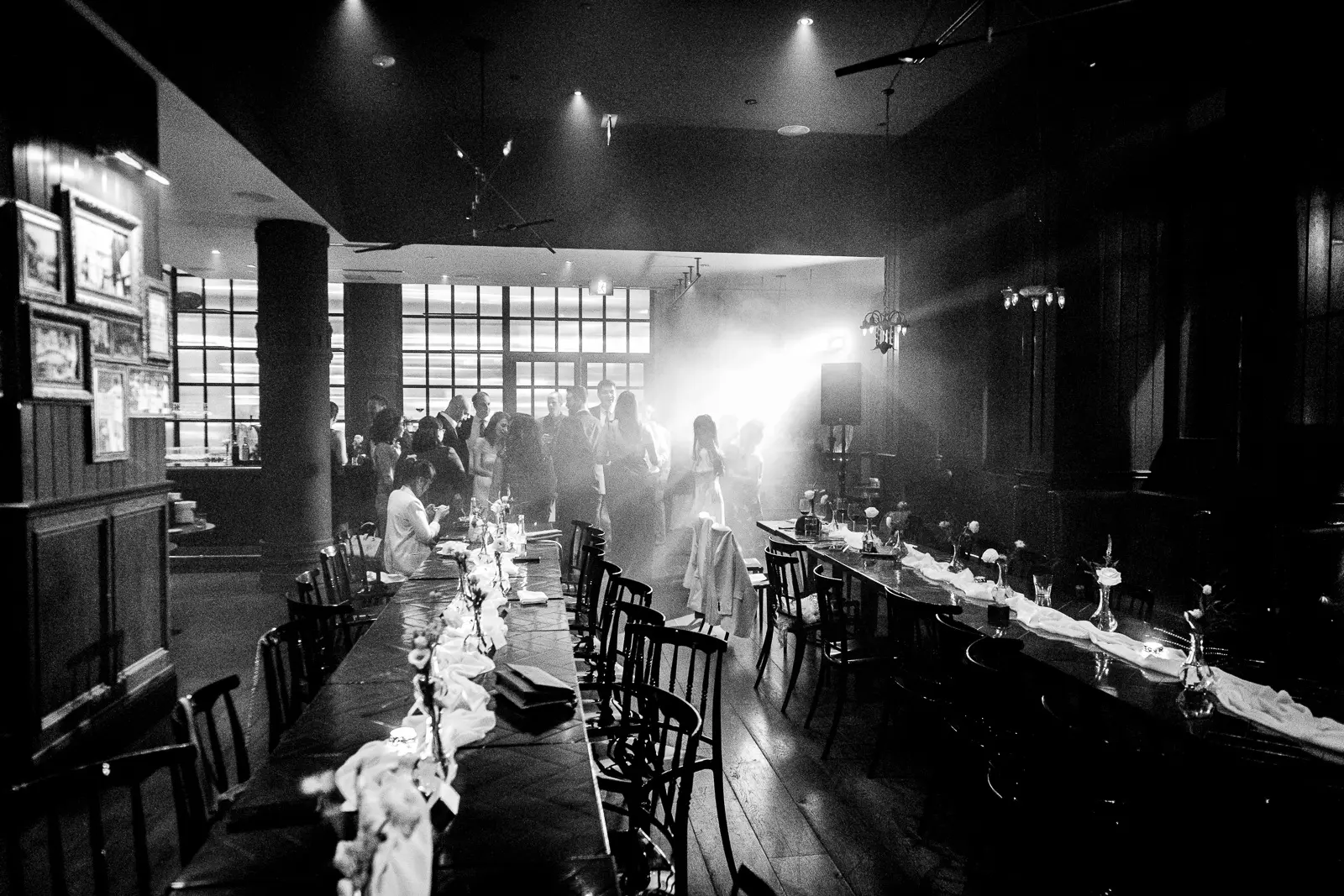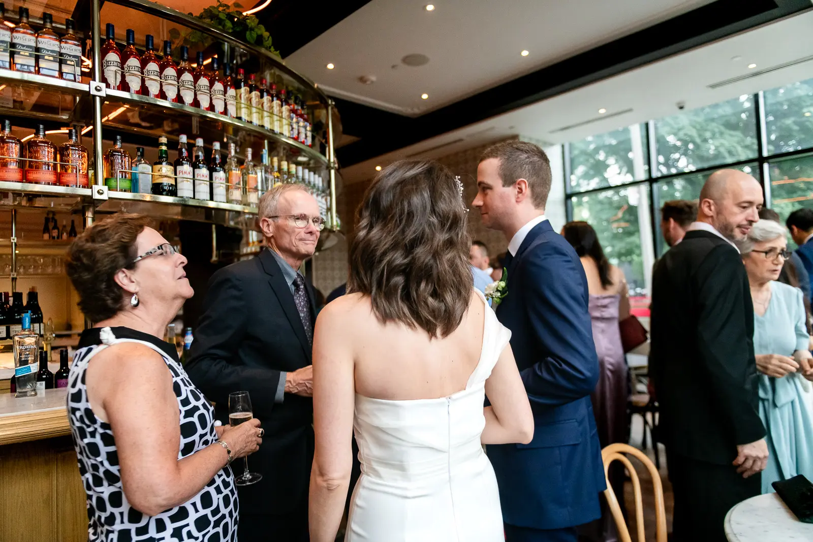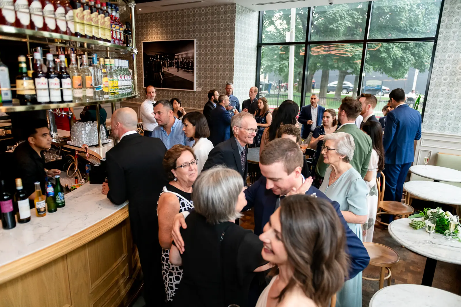 This space carried a distinctly downtown energy—warm lighting, textured interiors, and a steady hum of conversation. It was relaxed, social, and full of movement as guests reconnected and celebrated the newlyweds.