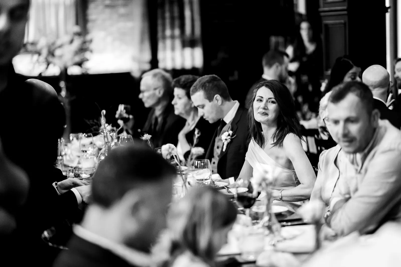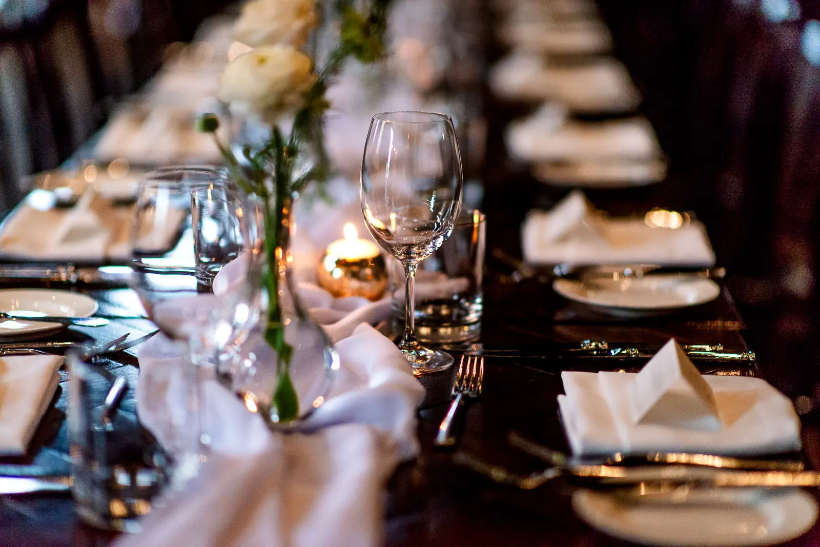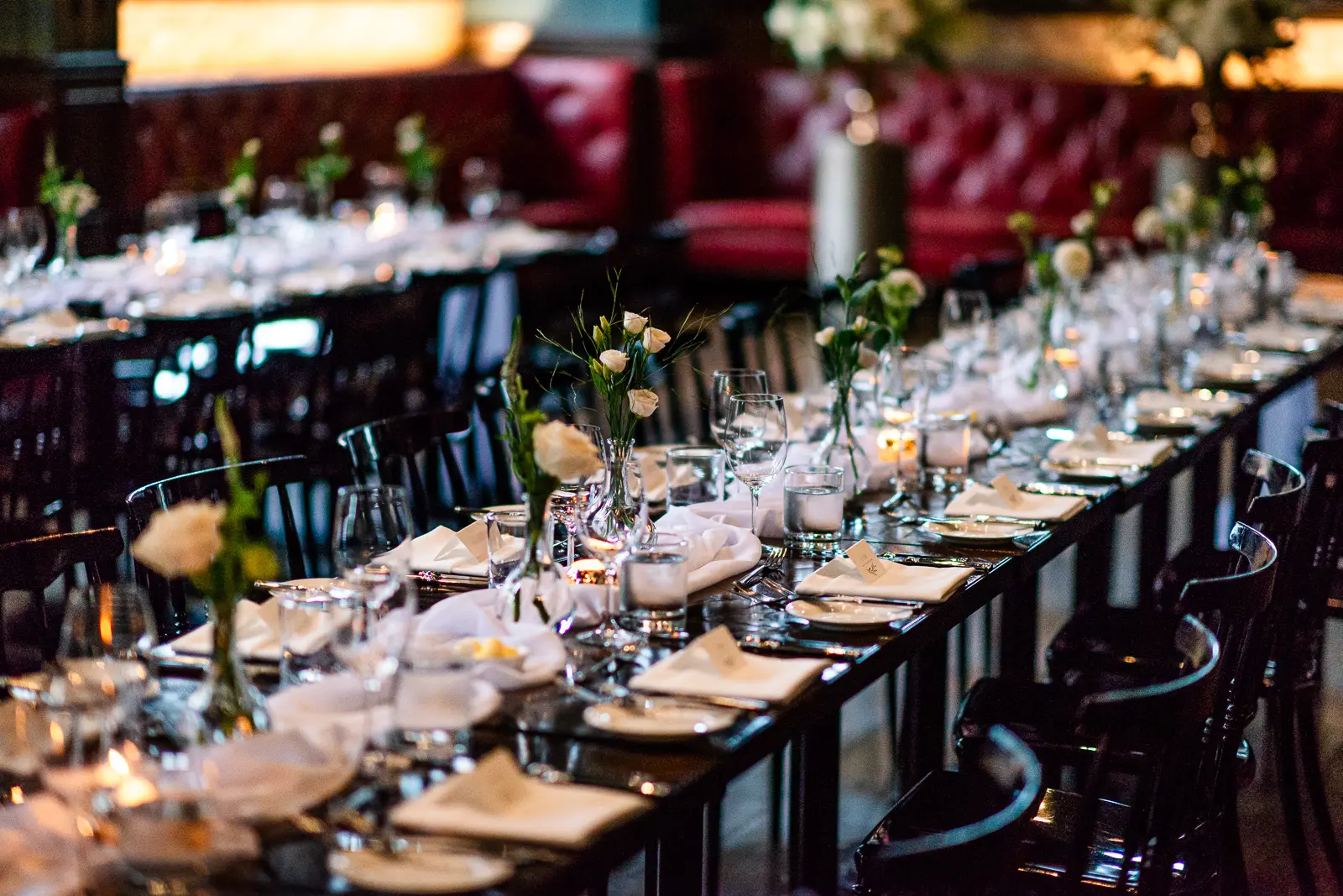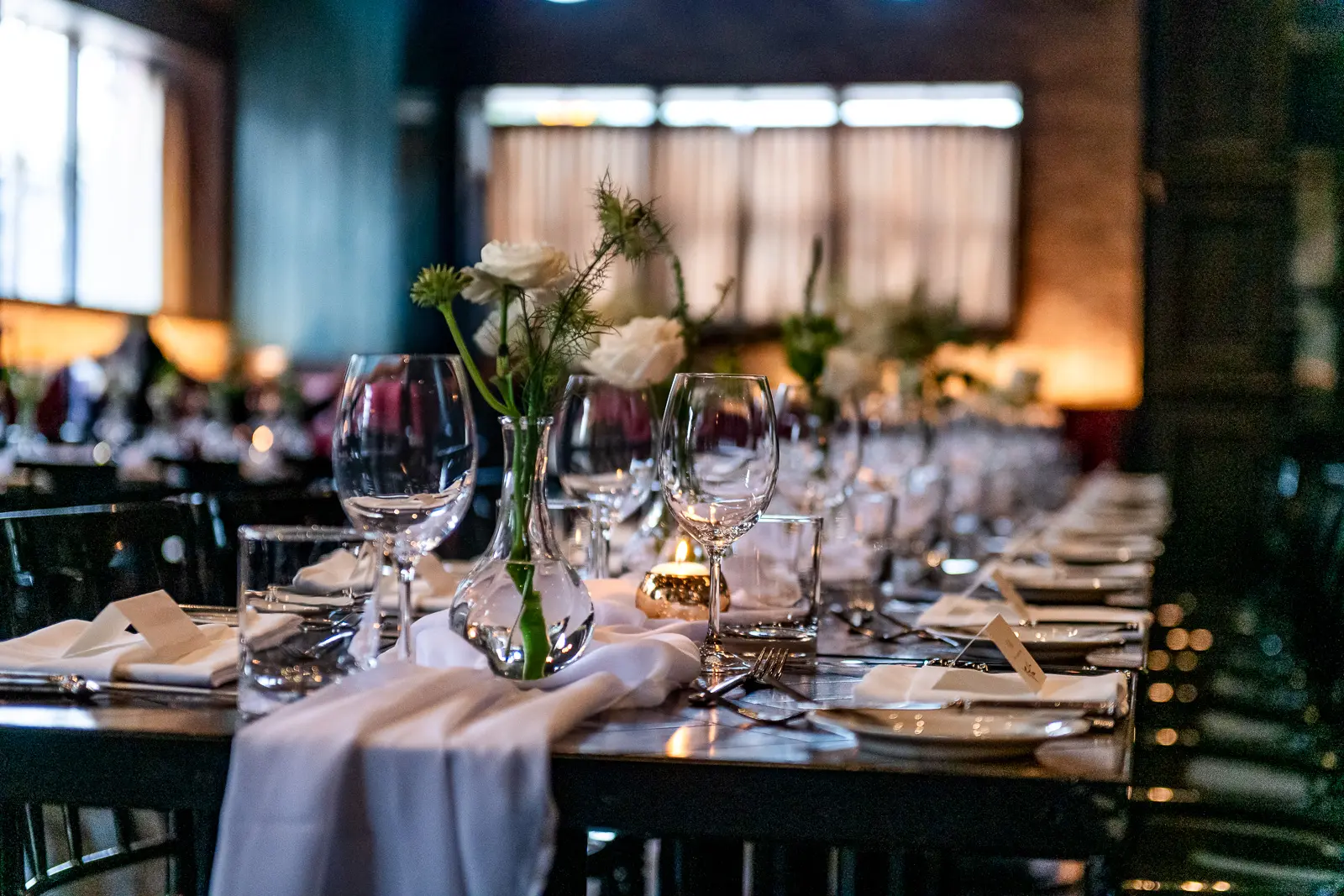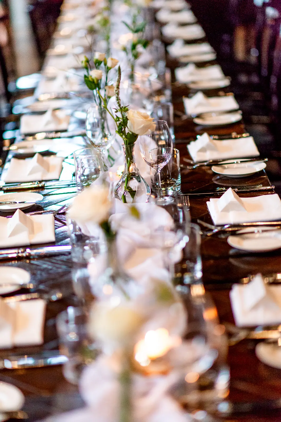 The reception carried forward the same intimate atmosphere as the ceremony—long tables, warm candlelight, and guests freely moving between conversations rather than staying seated.